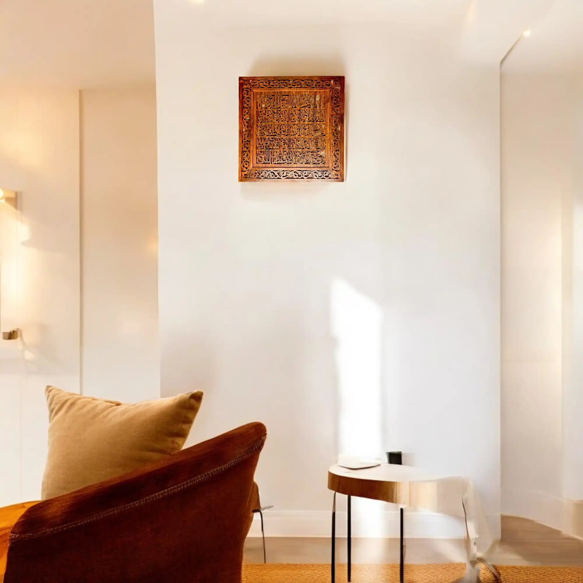 Encased in a floral carved frame, the square design allows for elegant alignment in any setting—be it the heart of your living space or the quiet solitude of your musalla. The richness of the natural wood radiates warmth, grounding the powerful verse with earthly beauty.