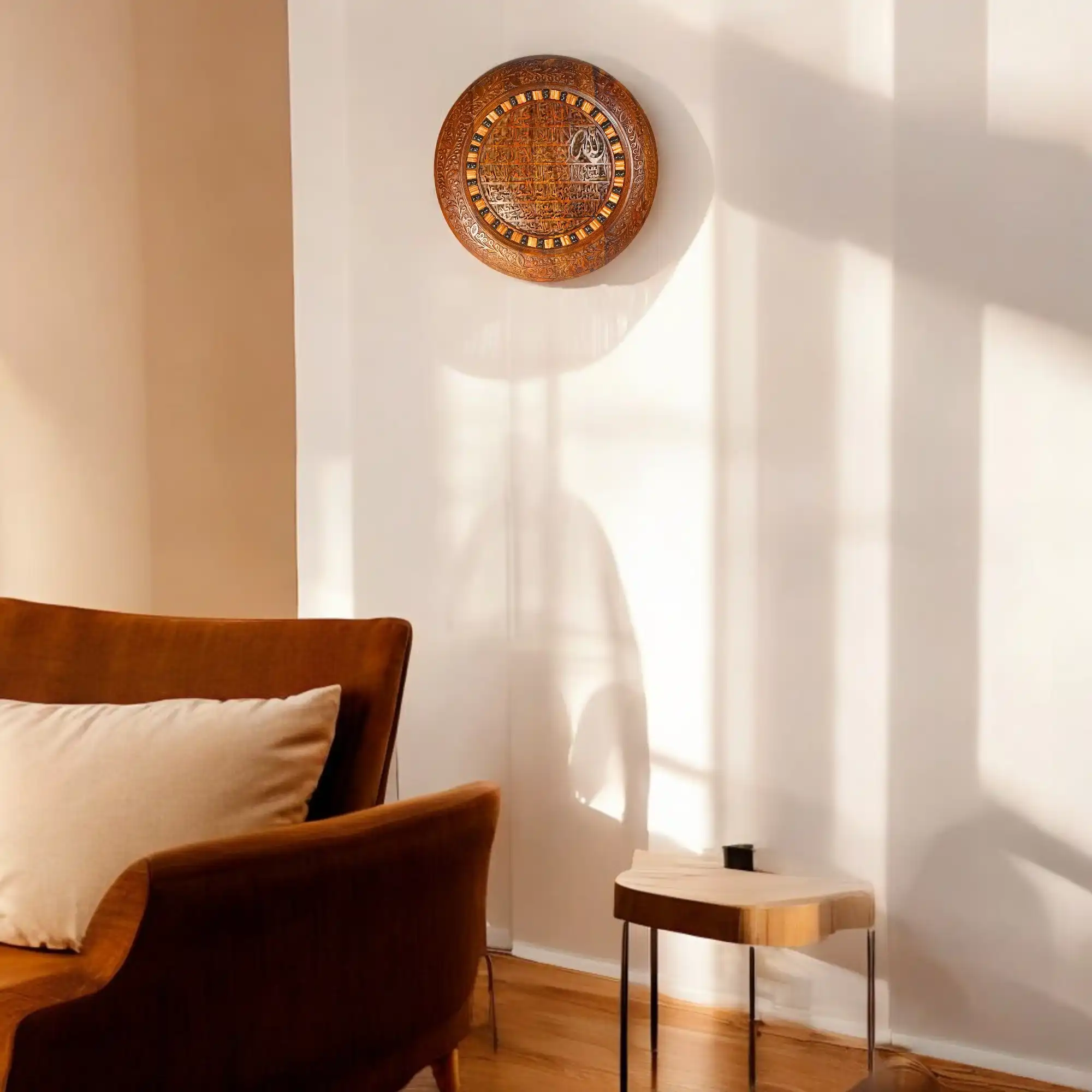 This handcrafted wooden wall decor showpiece brings Ayatul Kursi to life in a radiant circular form, gracefully carved across rich brown grain and framed by intricate detailing. At 17 inches in diameter and a solid 1.5-inch girth, it doesn’t just hang—it commands.