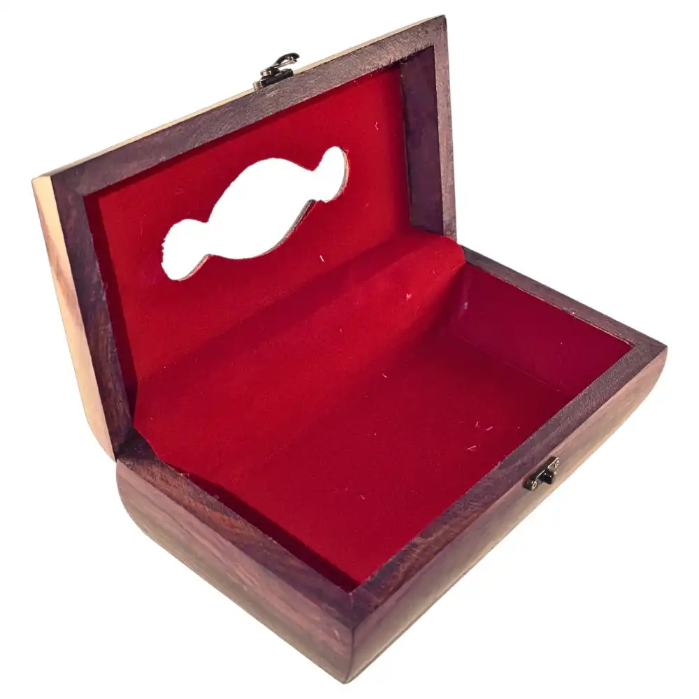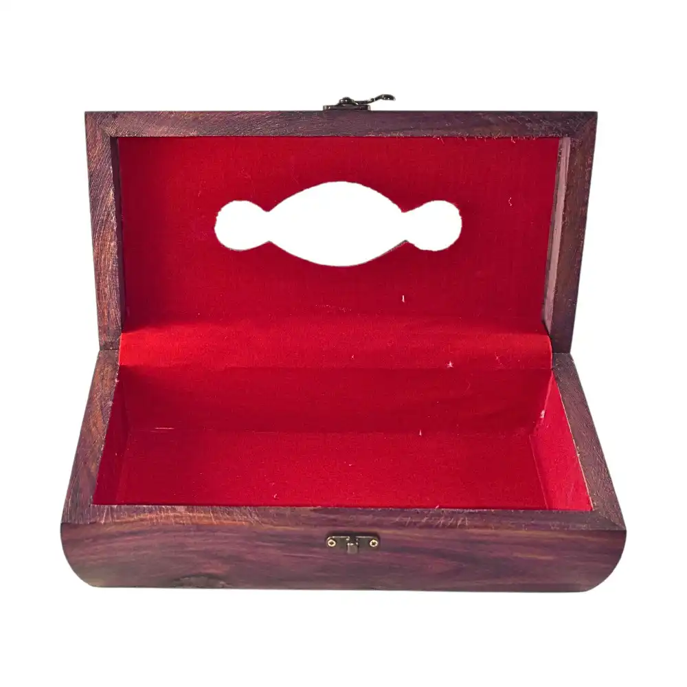 Barqiya is a tissue box, but not a quiet one. Its carved design brims with floral patterns and vinework—boldly laid into smooth, dark wood. The shape is gently curved, and the opening is unlike most—two flared lobes echoing Mughal latticework. Inside, a crimson velvet lining waits. Functional, but filled with flourish.