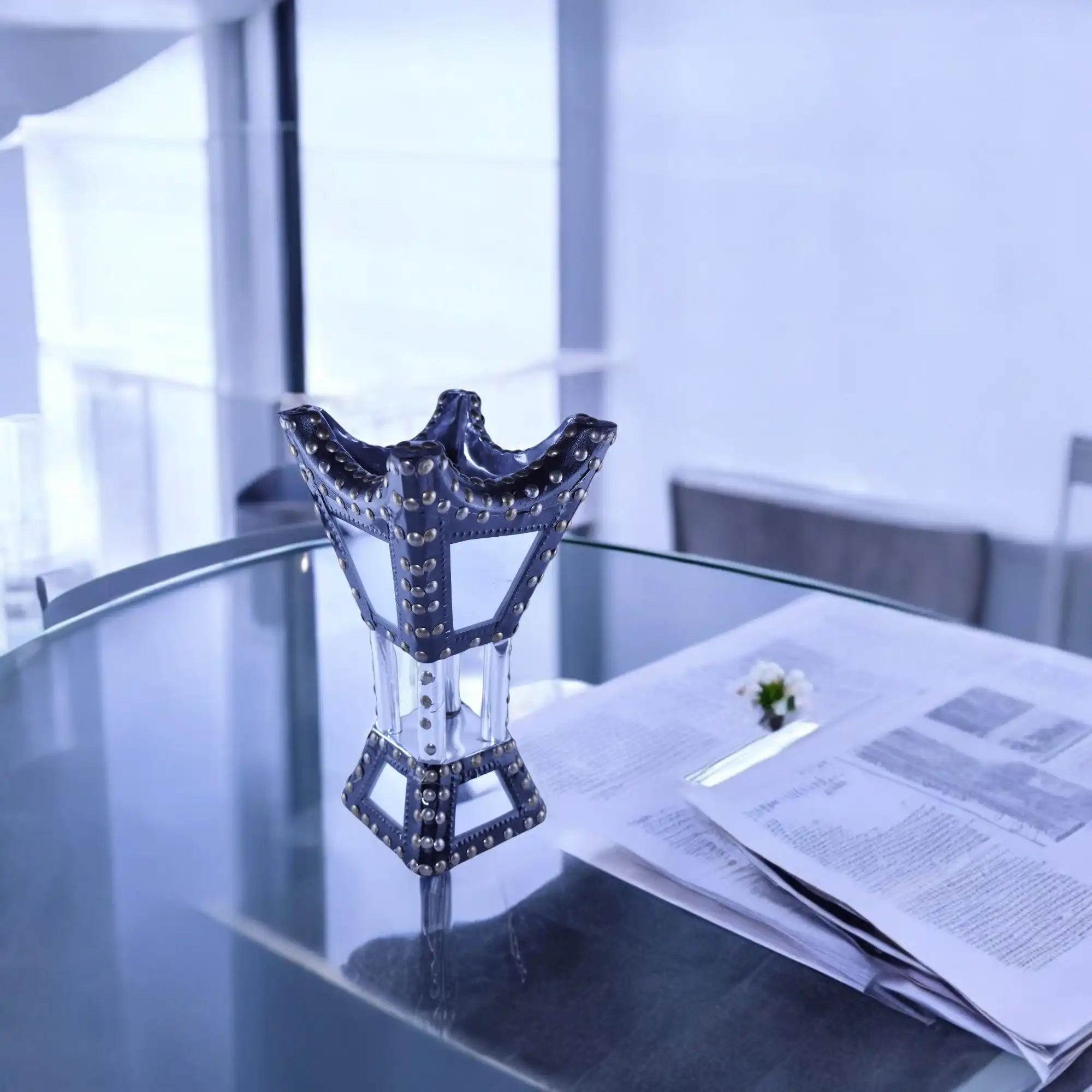 This black incense burner is bold in form yet grounded in heritage. The sharp black surface, framed by silver studs, gives this incense burner a quiet authority — strong, clean, and composed. Crafted from aluminium and mirror panels, its geometric form draws inspiration from regional traditions while offering functionality and stability. A piece that doesn’t shout for attention but earns it over time. Perfect for spaces where scent matters and detail is noticed.
