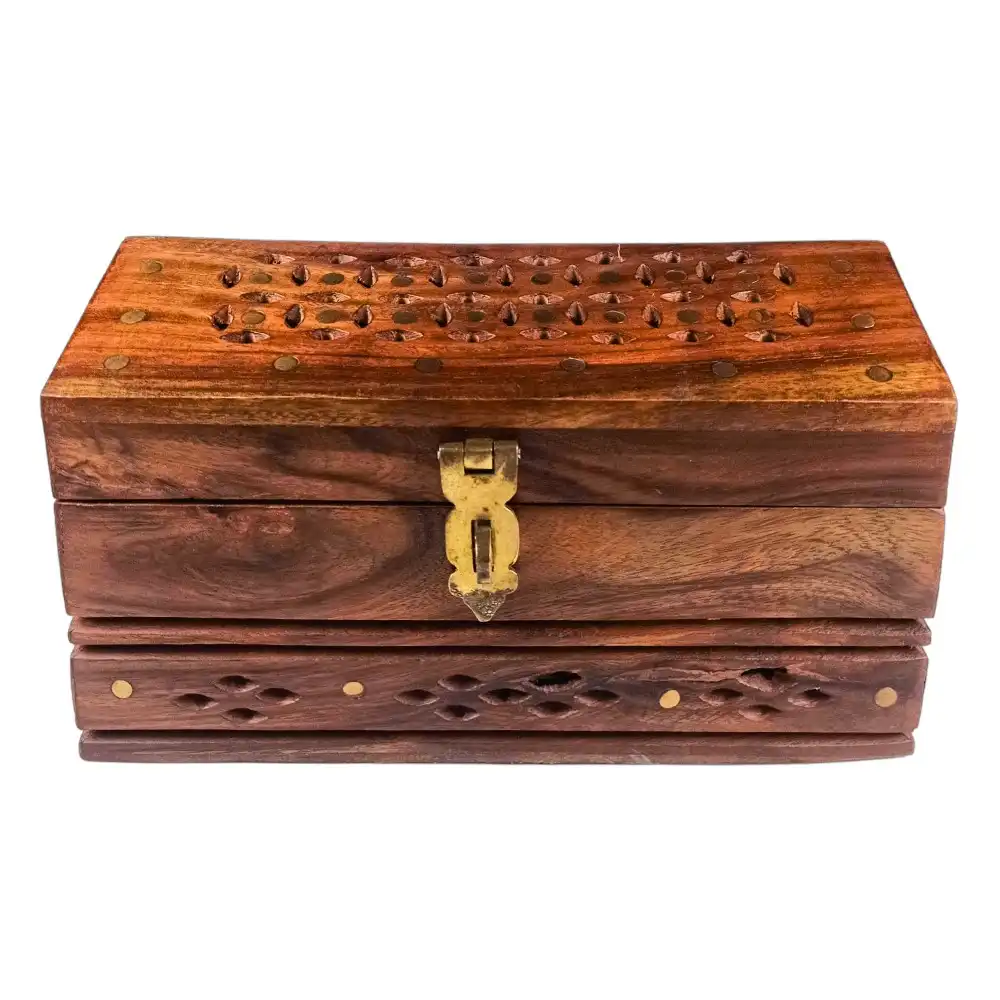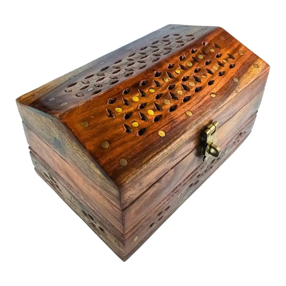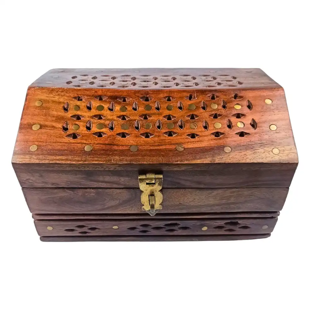 A box like this is not picked—it’s chosen. Its dome-shaped curve and lattice brasswork feel like something ancient, yet familiar. This isn’t just storage; it’s a quiet corner for the things you never want to lose: a ring from someone gone, a chain passed through generations, a letter, folded twice. The moment you open the clasp, you’re opening more than wood—you’re returning. For those who don’t collect things, but preserve time.