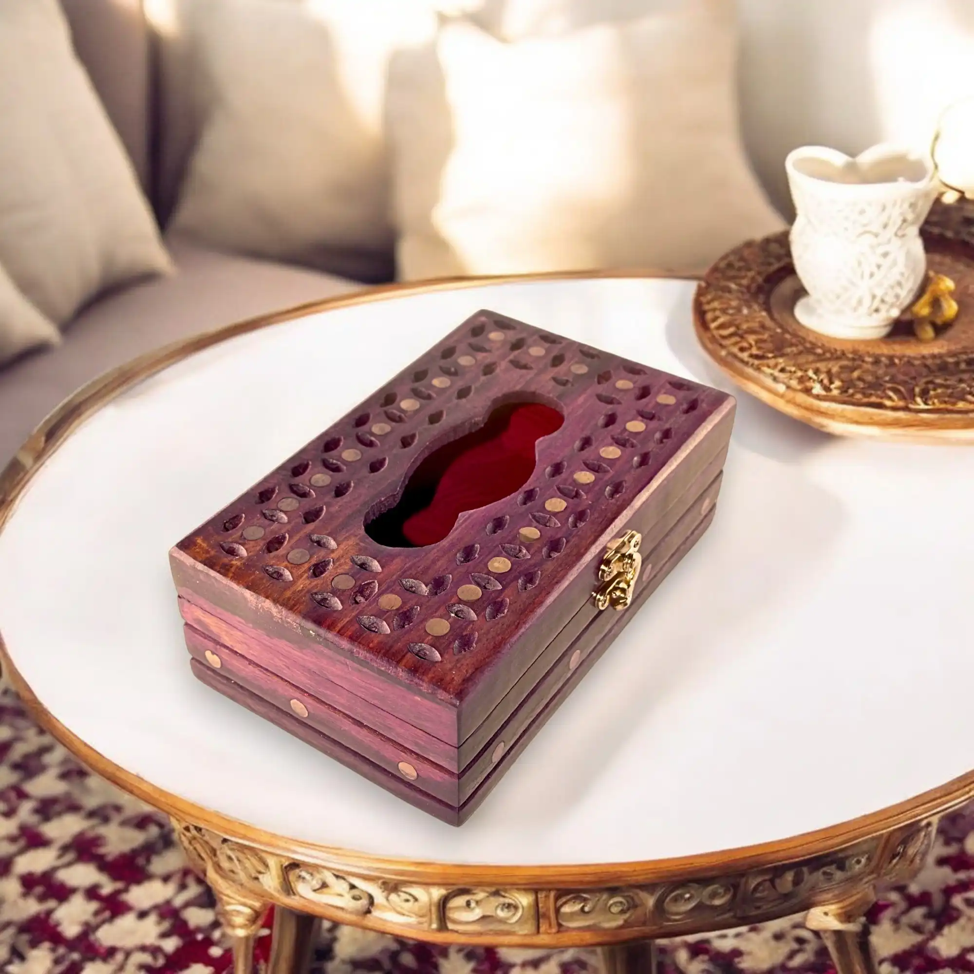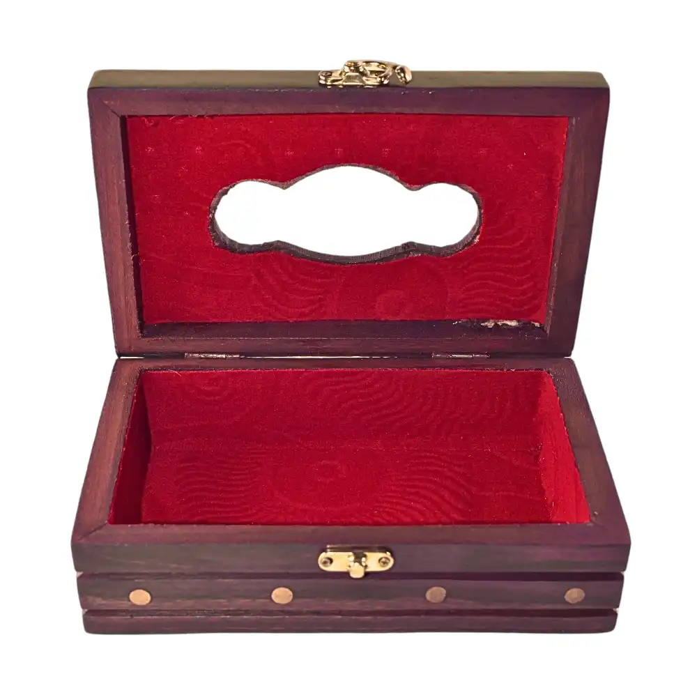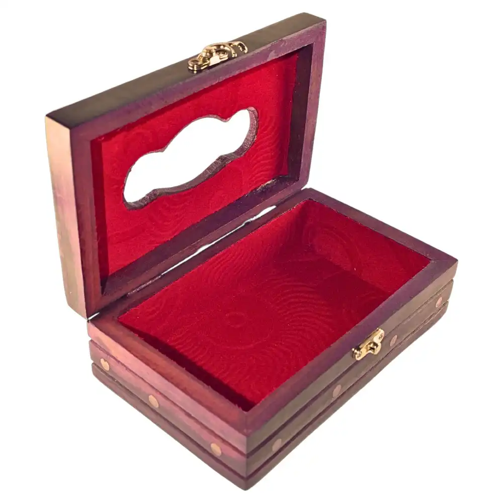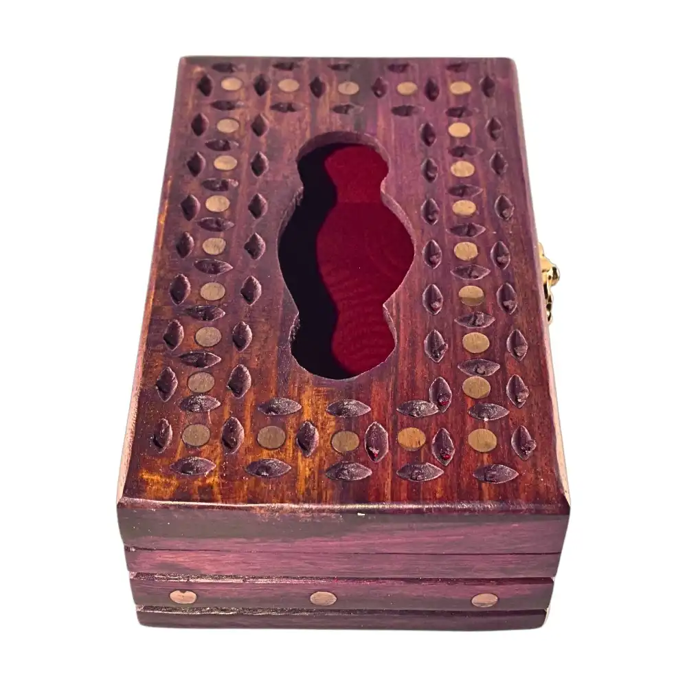 A box that speaks softly, like poetry on a winter morning. With a curved cutout, dot-and-leaf motif, and burnished inlay, Dotwork jewelry box offers more than function—it invites stillness. Crafted from sheesham wood and lined with plush red velvet, this box carries refinement in every curve. Keep it on a console, coffee table, or study—it will never ask for attention, but always deserve it.