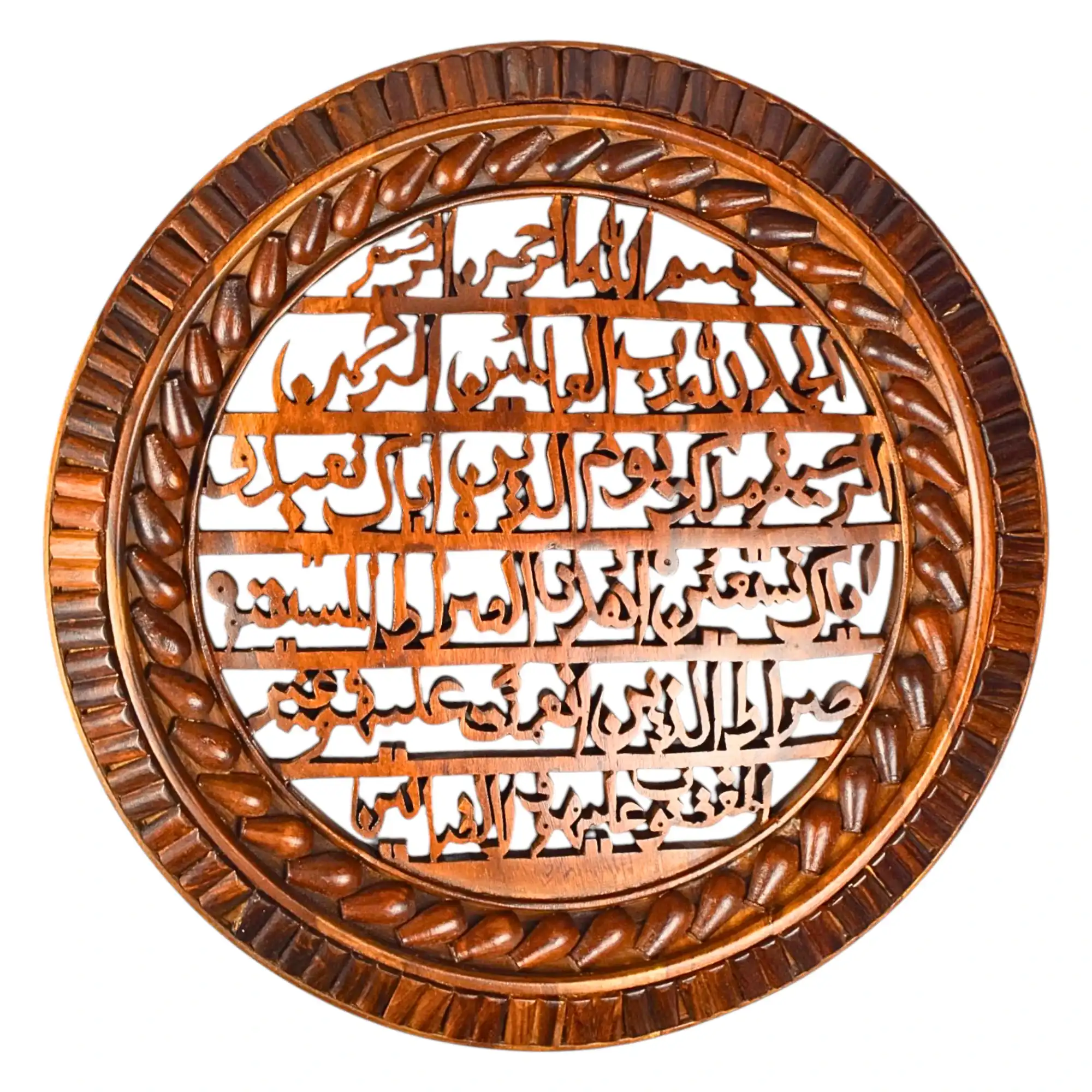 - Hand-carved Surah Al-Fatiha in bold Arabic calligraphy
