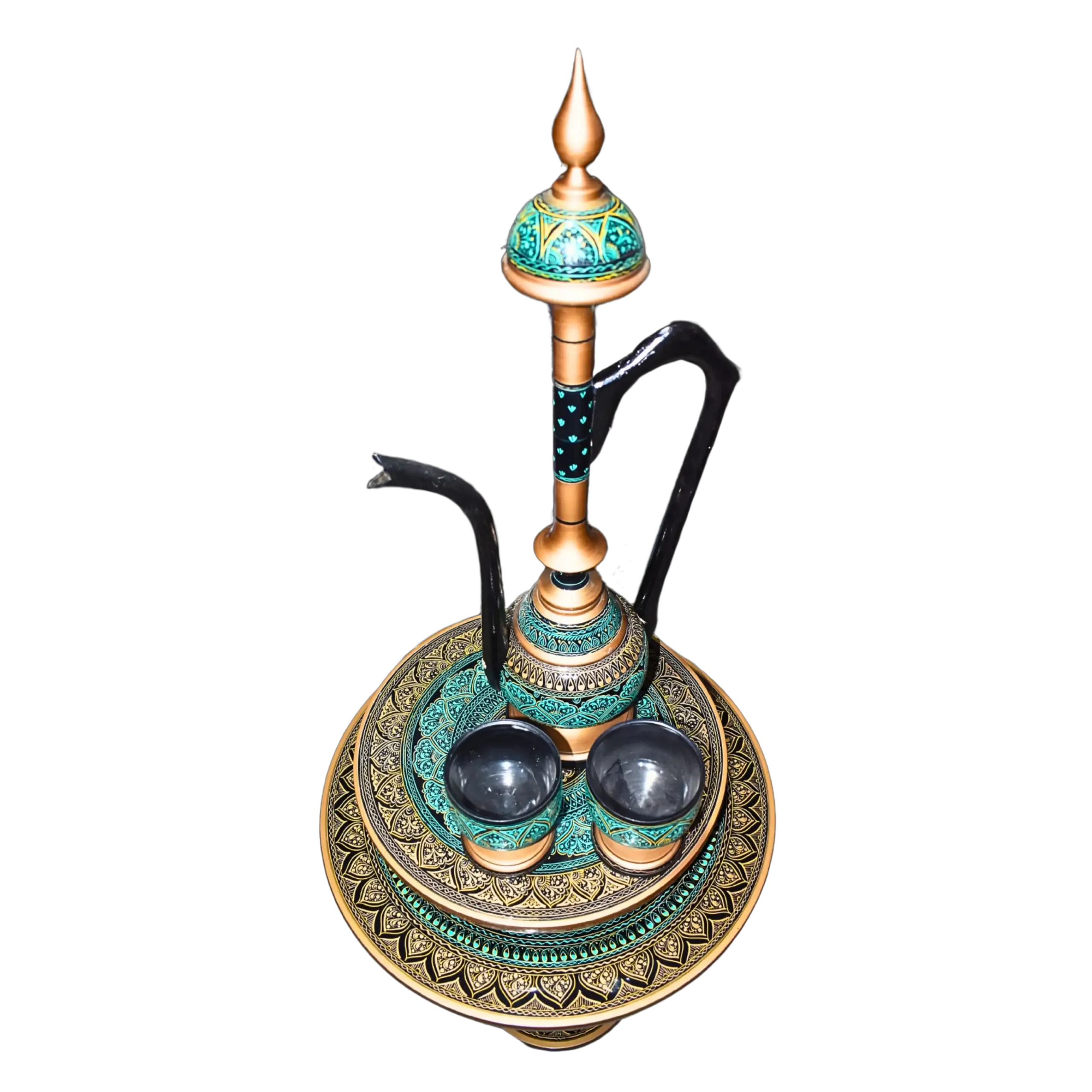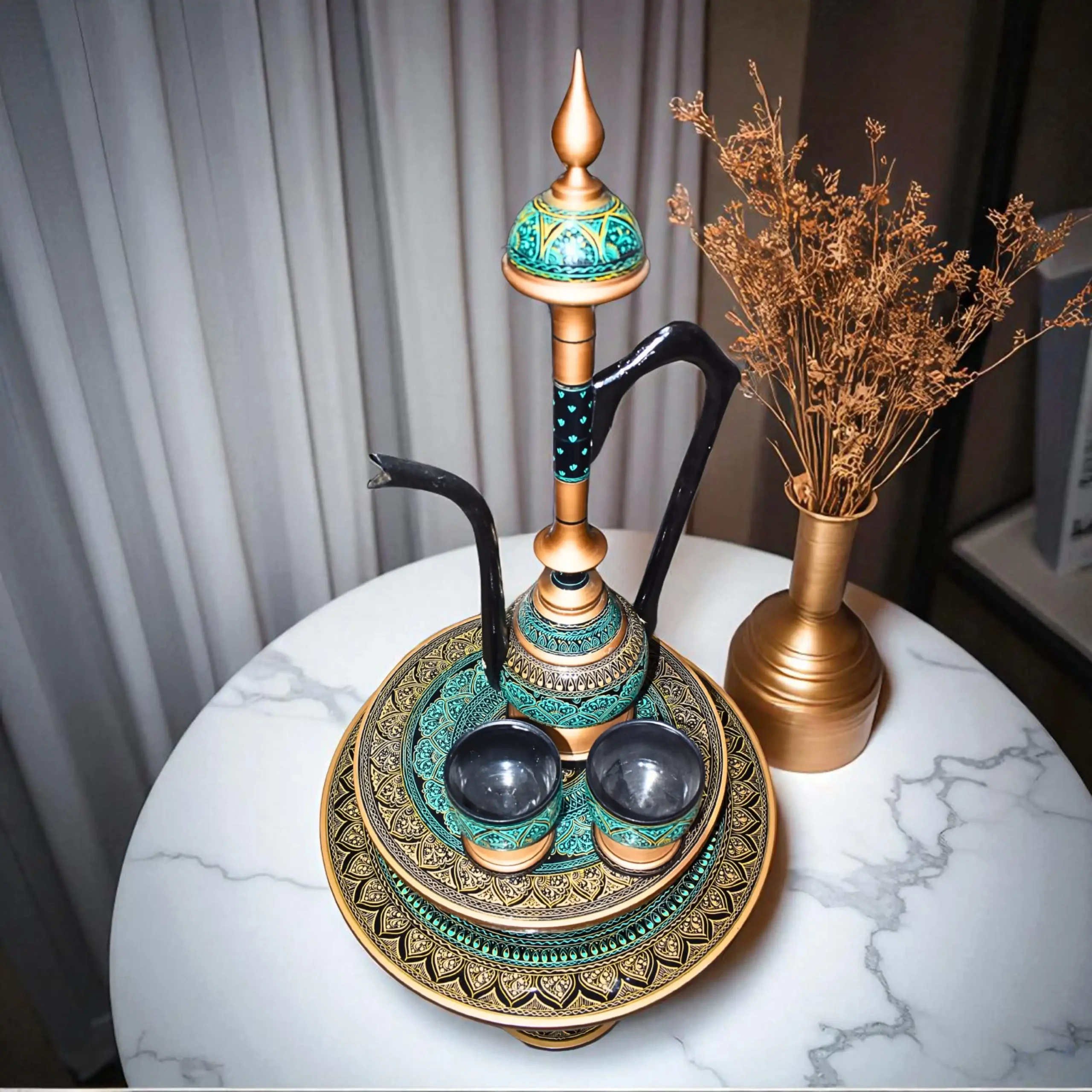 - Non-functional decorative ewer with 2 goblets and a round pedestal tray