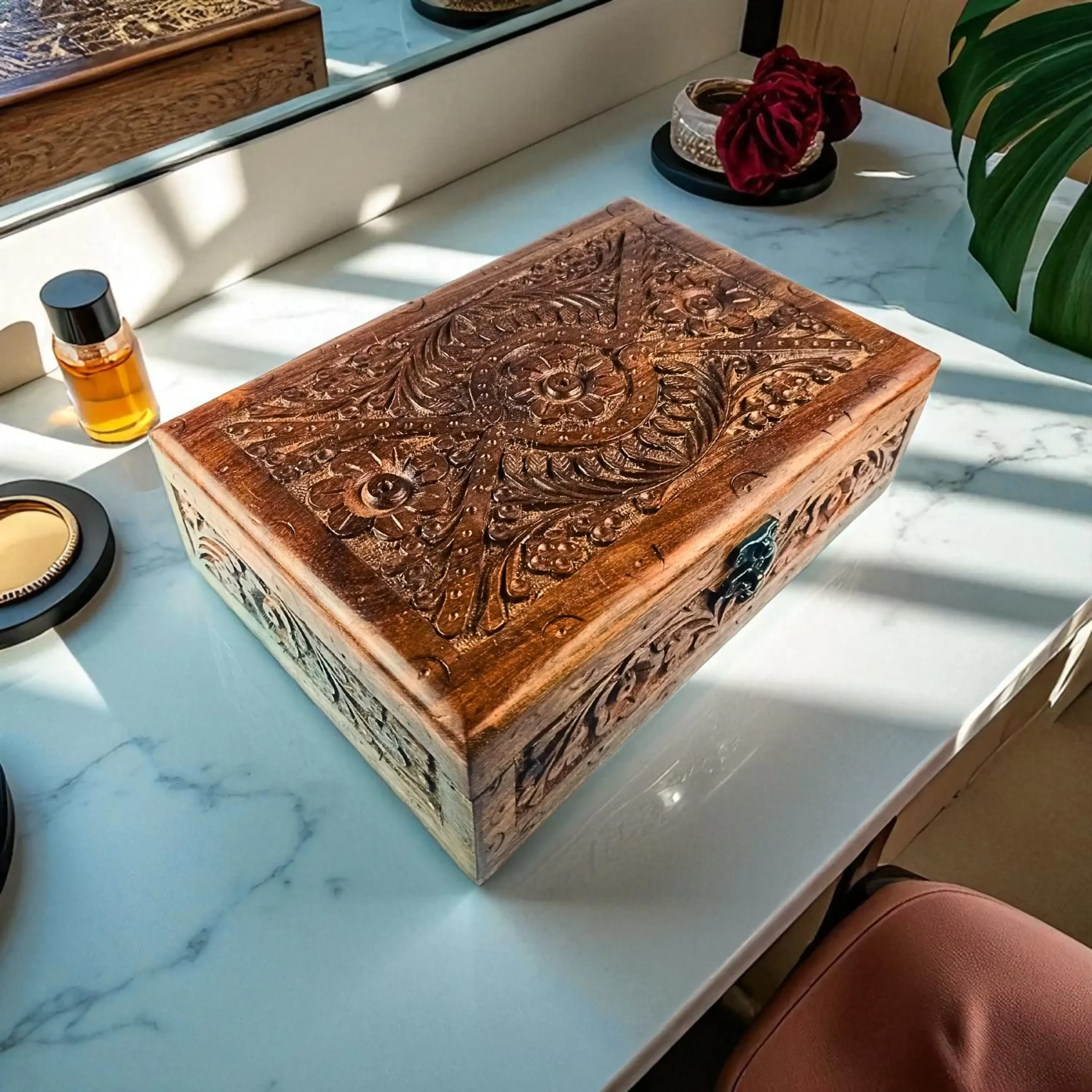 Flora feels like something that was never bought, only passed on. With its detailed carving — like petals caught in a wind spiral — and a velvet-lined interior the color of old silk, it brings a sense of rootedness. Not a box, but a space. For her grandmother’s ring, his old letters, a prayer, or a promise. It holds objects, yes, but it keeps them safe with meaning. This is for someone who values what stays — not because it’s useful, but because it mattered.