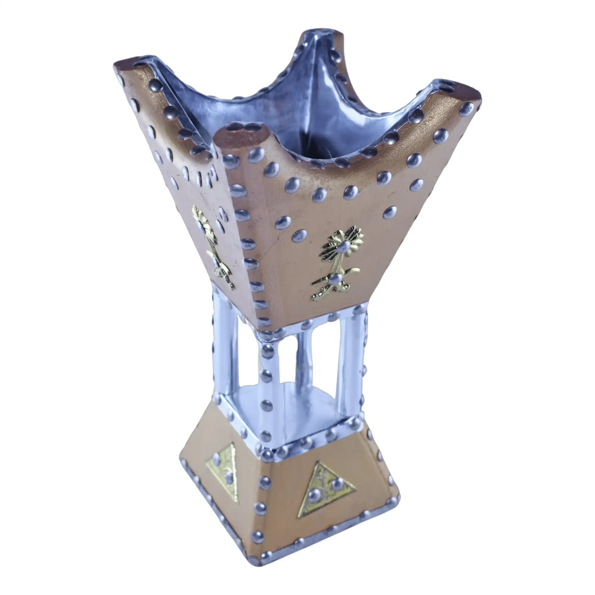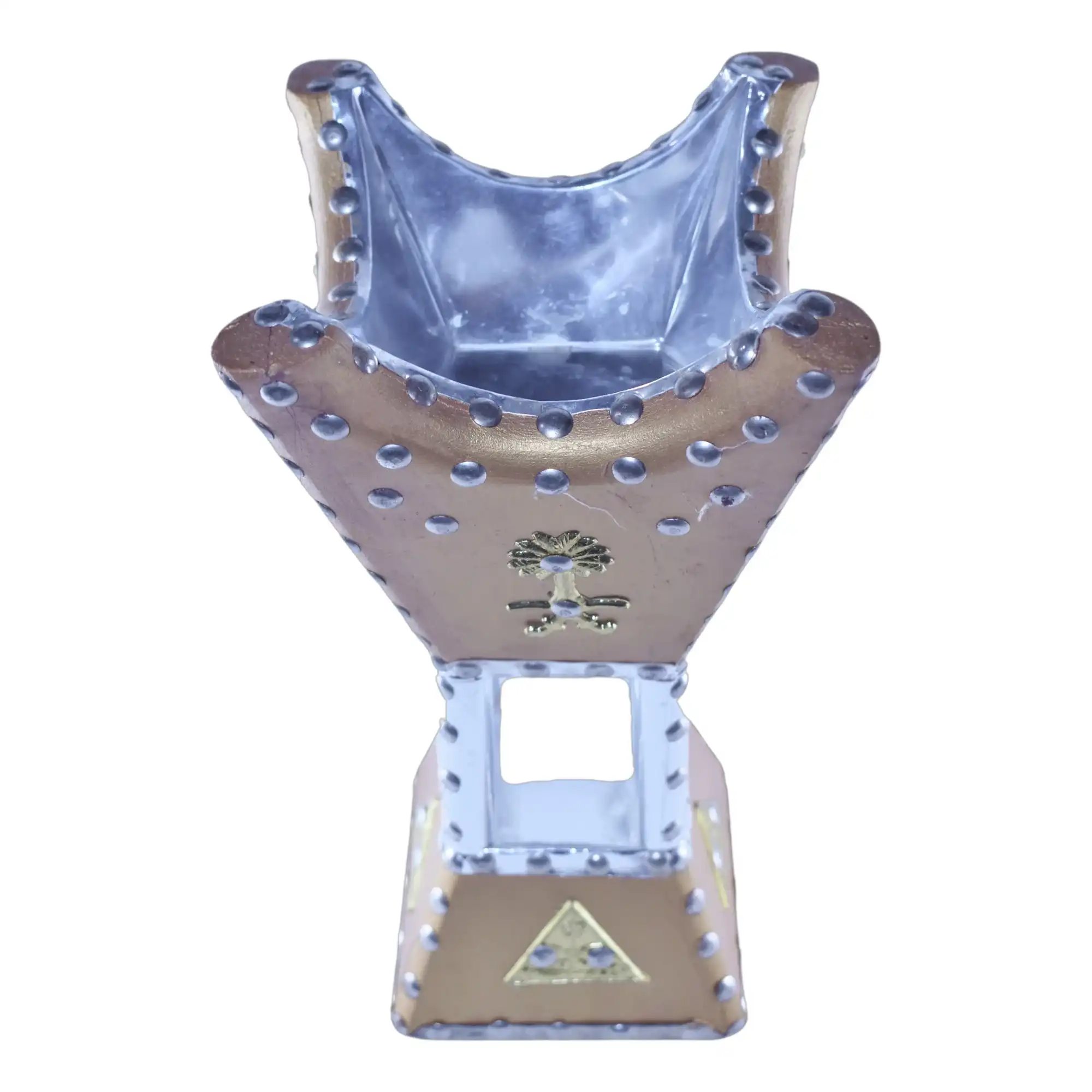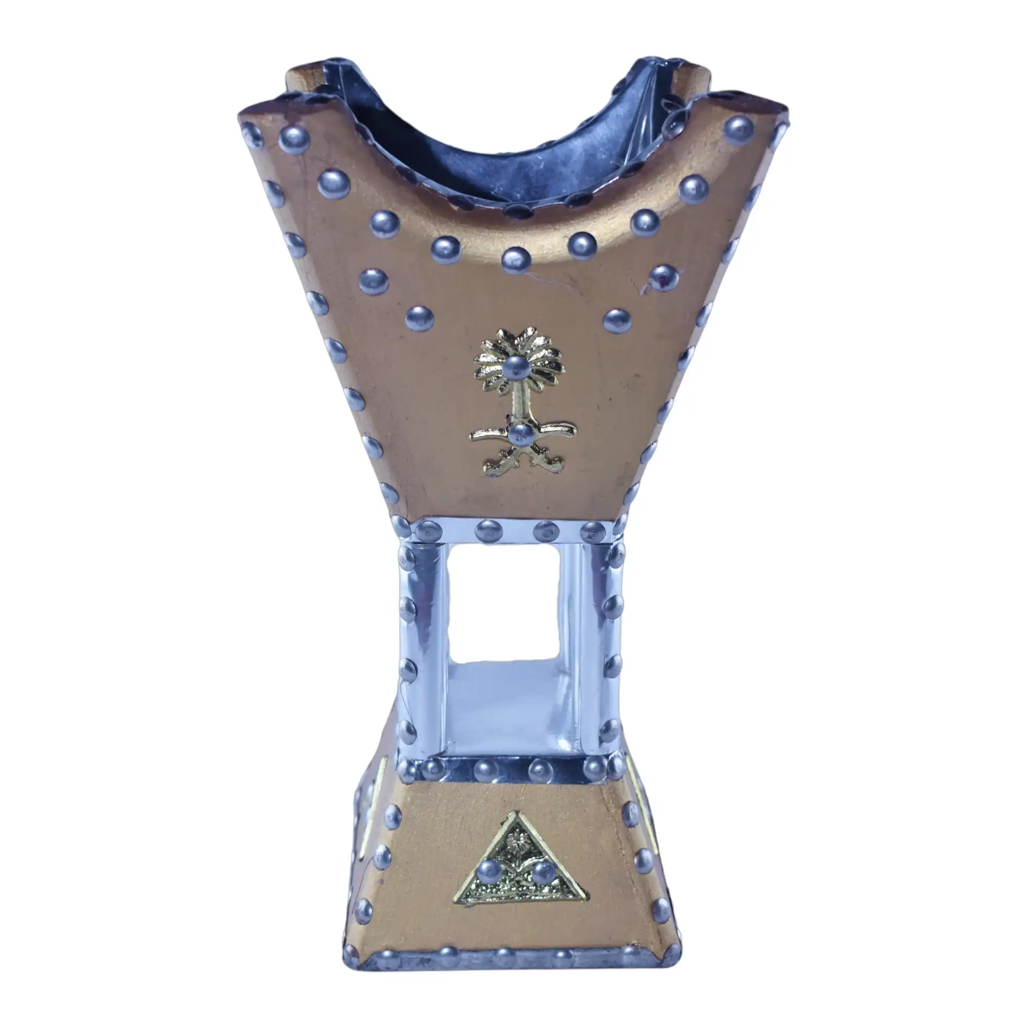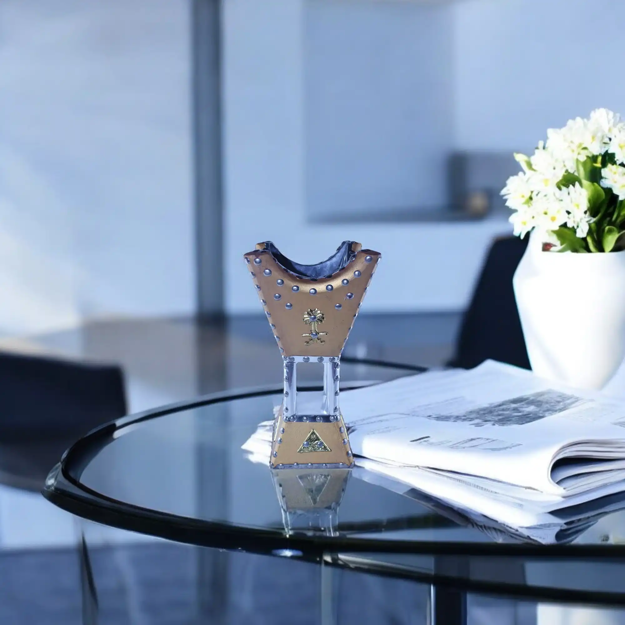 Bridging regal tradition and timeless charm, the Golden Mirage incense burner stands as a radiant tribute to Arabian heritage. With its iconic palm-tree emblem and burnished gold panels, this 11-inch tall mabkhara reflects more than scent—it reflects legacy. Balanced on a silver-pillared midsection, it creates space for both airflow and symbolism. Not too flashy, not too humble—this burner is elegance with intent. Made for gatherings, rituals, and peaceful corners alike, it’s not just a piece for burning bakhoor—it’s for holding presence.