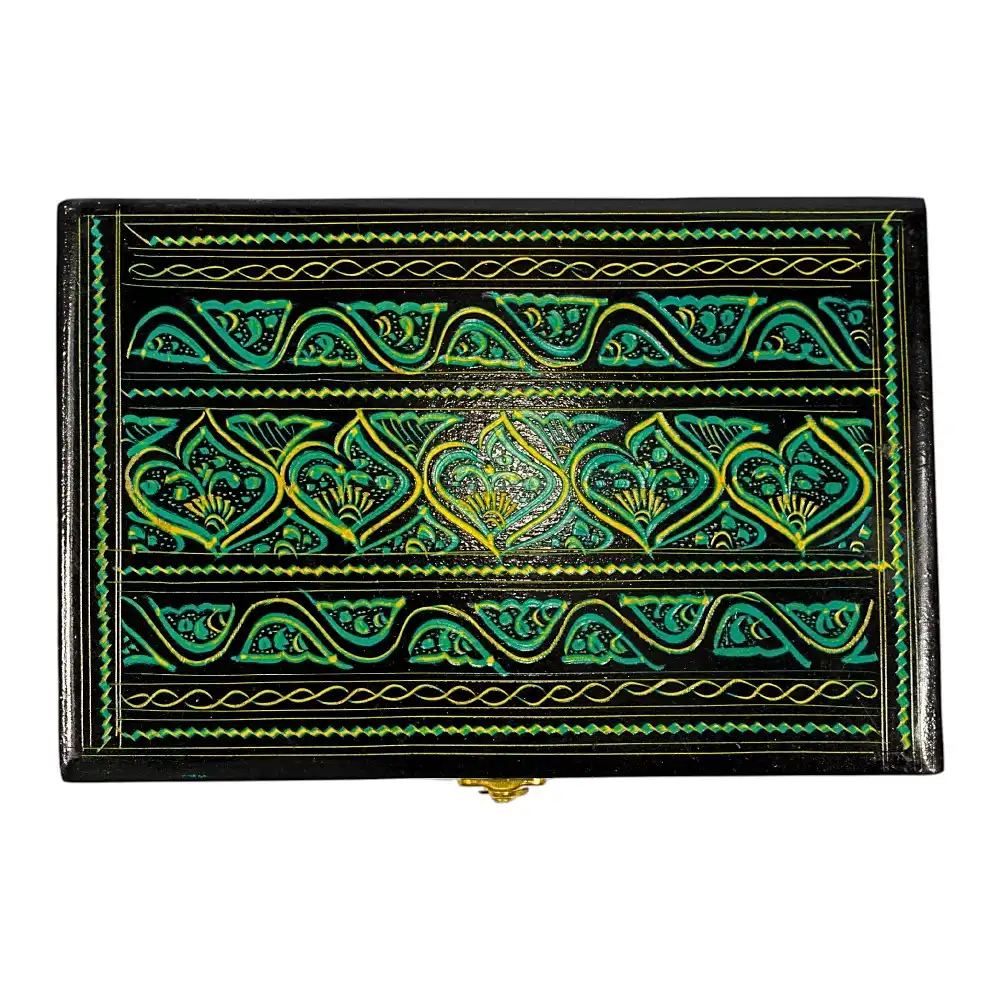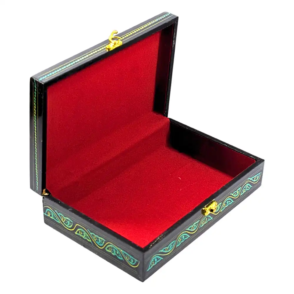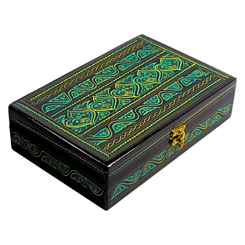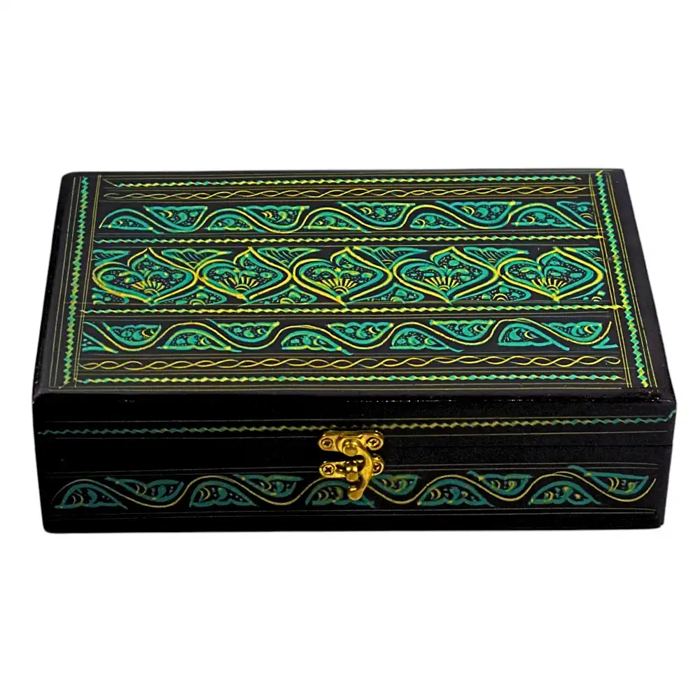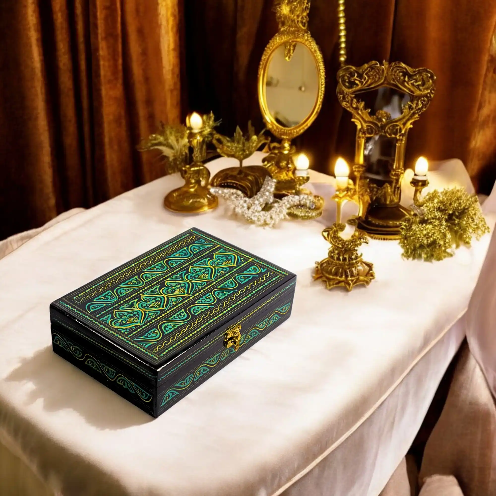 This handcrafted wooden jewelry case features classic green naqshi detailing, hand-painted across a polished black base. Compact and elegant, it’s perfect for gifting delicate jewelry—or simply keeping your favorite pieces safe in style. Whether you’re celebrating someone special or treating yourself, this box adds just the right touch of tradition and charm.