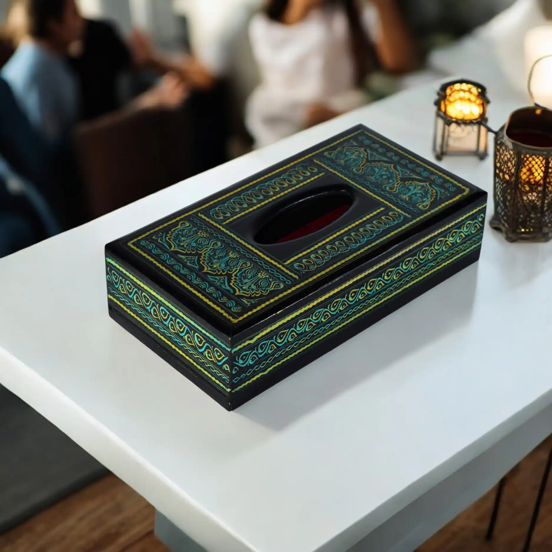 This tissue box features traditional green naqshi art on polished black wood. Made to hold a standard-size tissue pack, it opens from the bottom and is easy to refill. The design is simple, yet it brings a distinct cultural touch to your space—something quiet but noticeable on a coffee table, desk, or in your guest room.