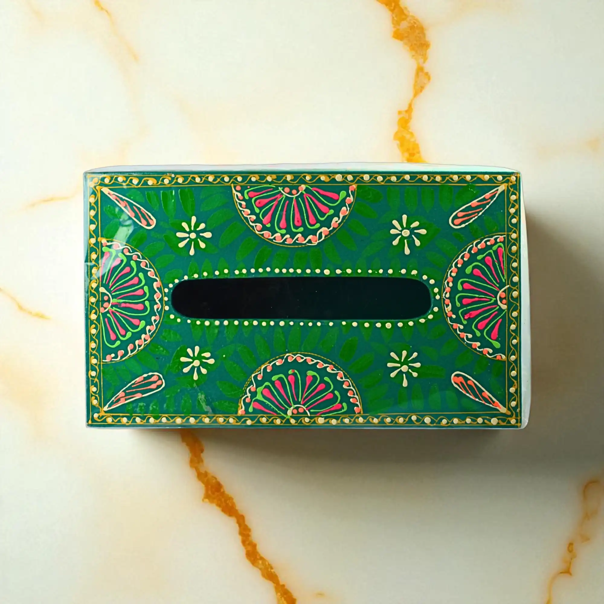 A nod to South Asian truck art, this green wooden tissue box brings expressive design to the everyday. Its surface is handpainted in floral mandala patterns and ornamental borders, echoing the vivid aesthetic of roadside art. The finish is lacquered for durability and shine. Designed for both function and display, it fits standard tissue packs and elevates tabletops, vanities, or waiting areas with personality and warmth.