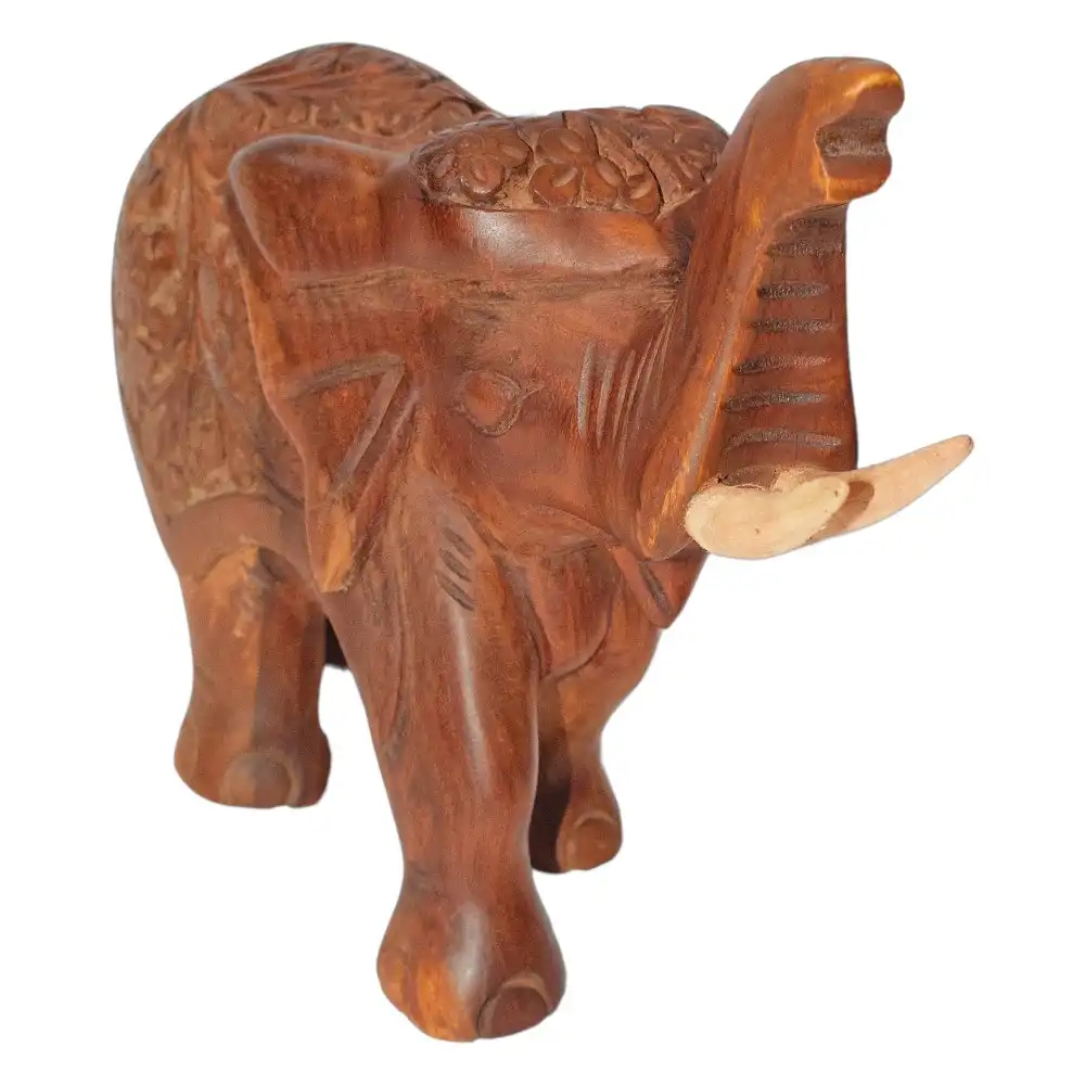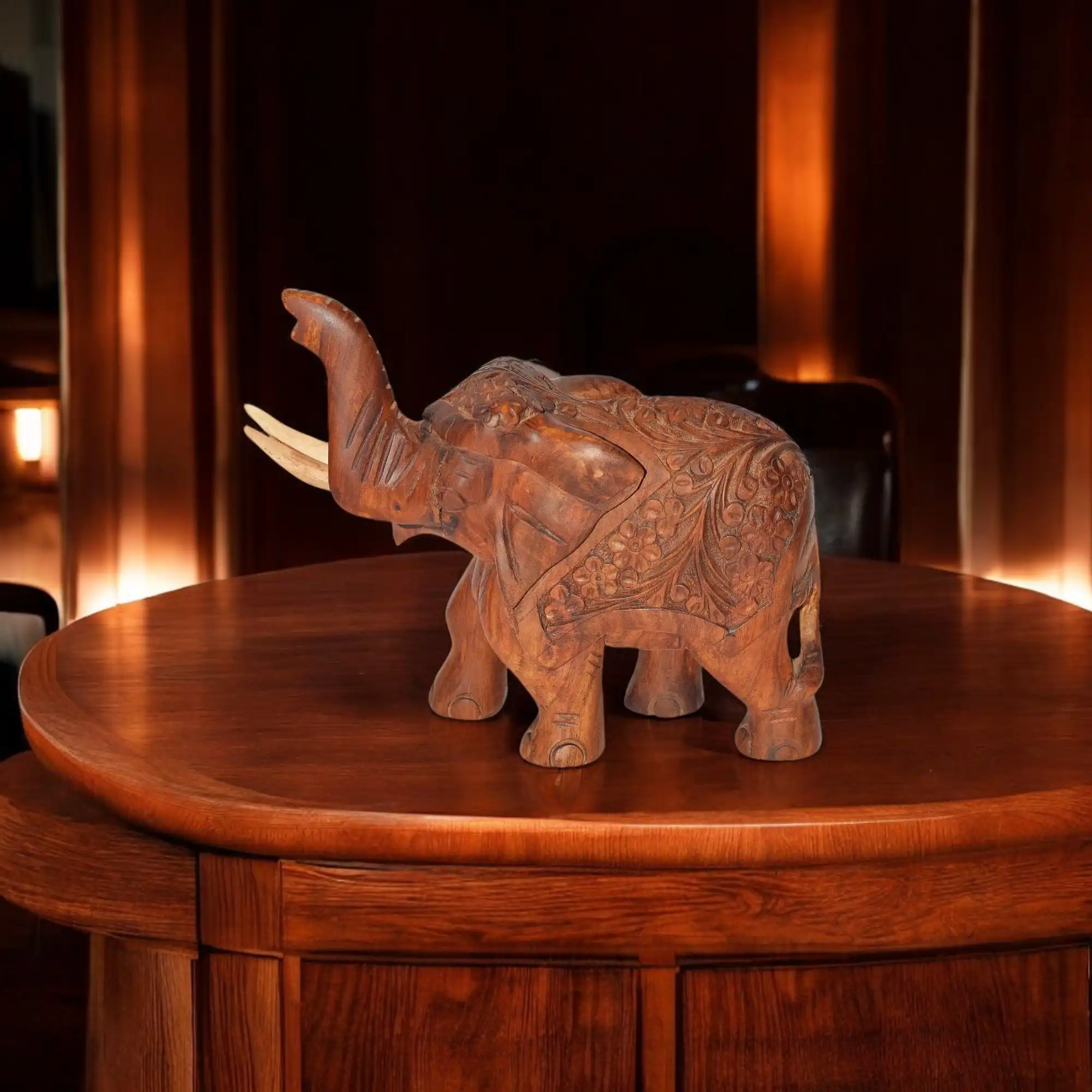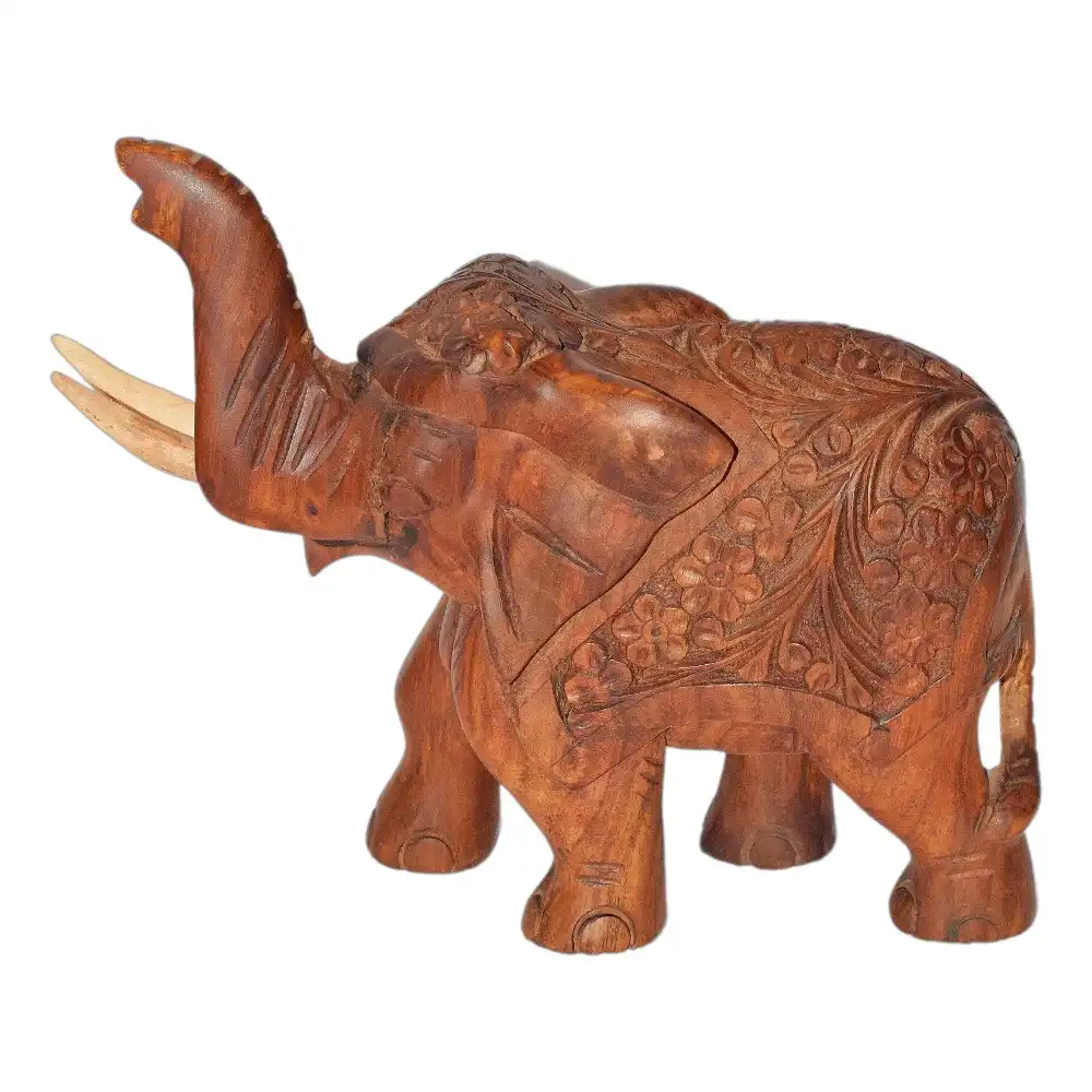 - Majestic tusks and upraised trunk carved from bone or ivory substitute