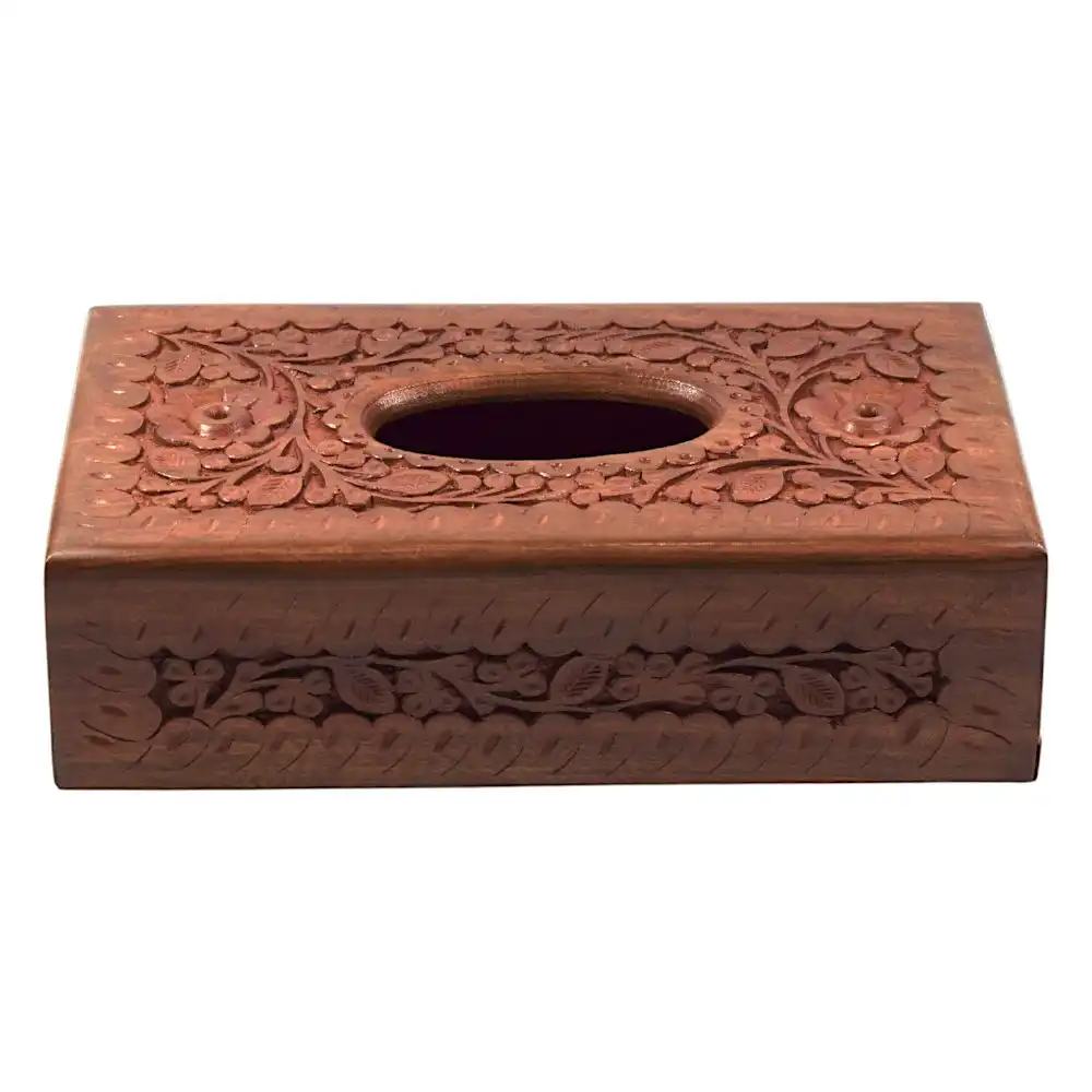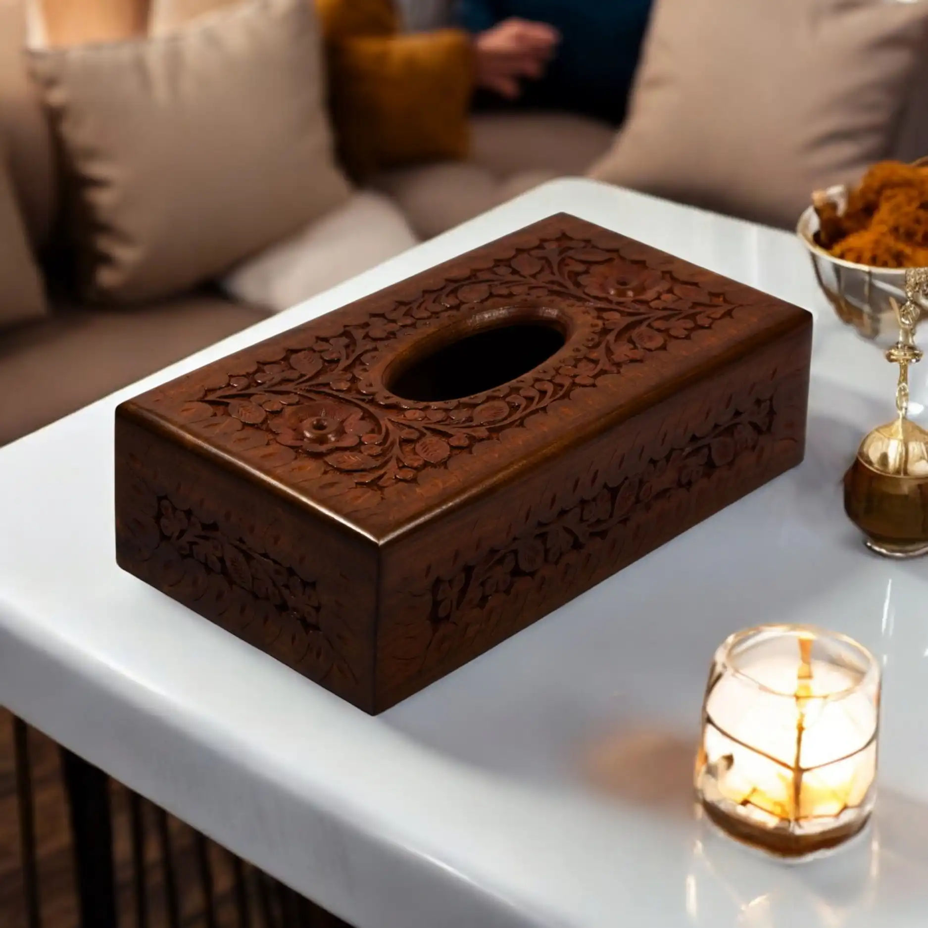This hand-carved tissue box is made from solid wood and features floral relief work on all visible sides. The detailed flower-and-vine design adds texture and warmth—perfect for living rooms, offices, or guest spaces. It fits standard tissue packs and opens easily from the base.