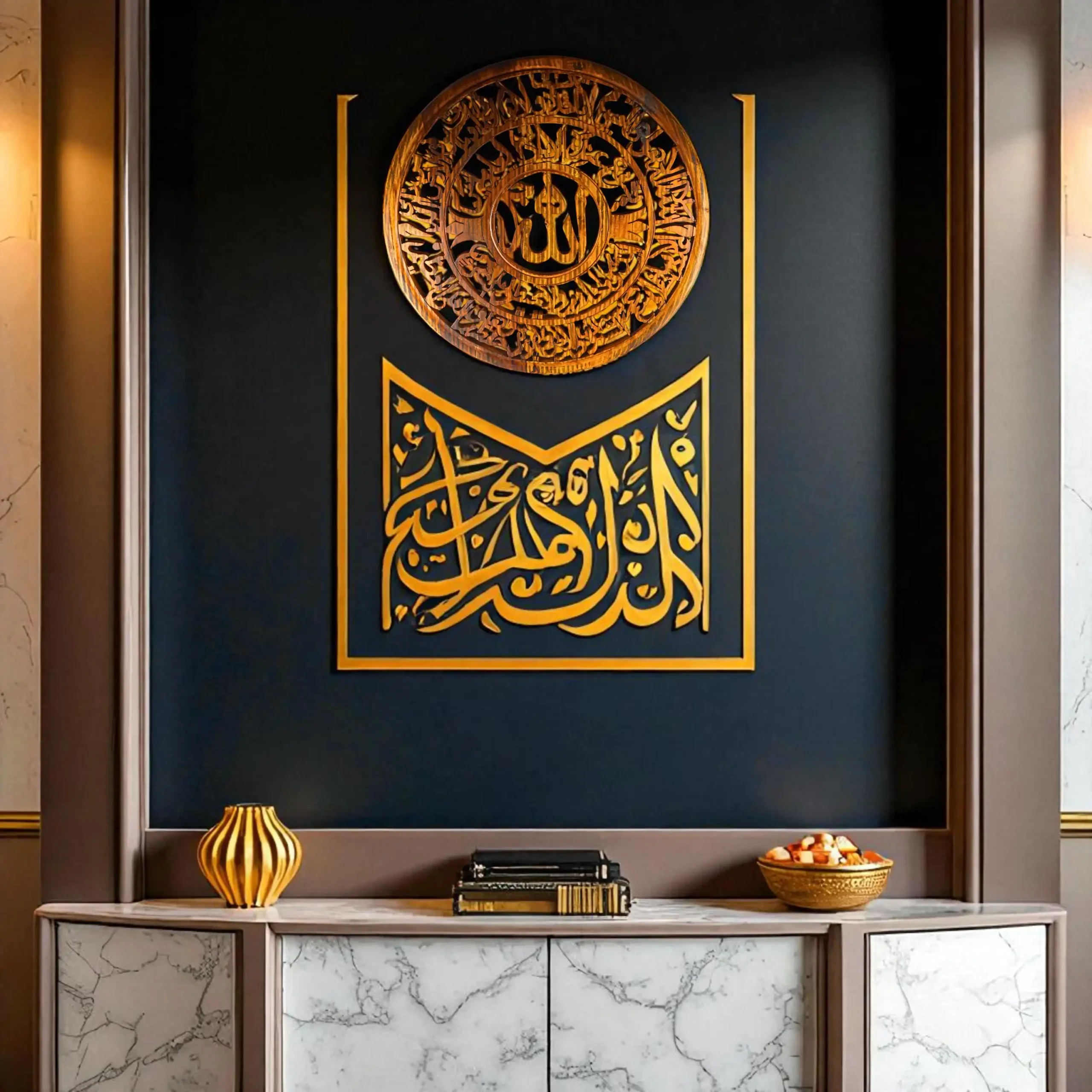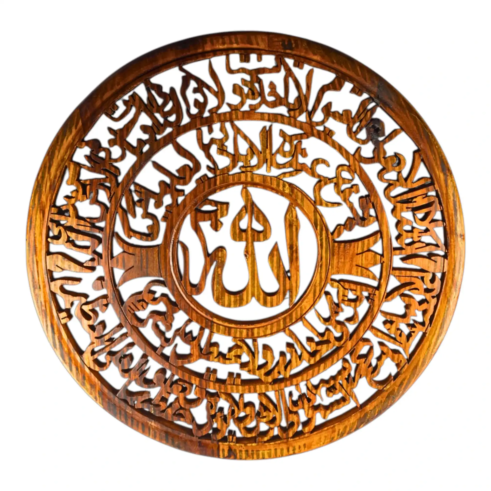 A classic circular wall piece that quietly commands attention. At its heart is the name of Allah, surrounded by the sacred Darood Shareef — every line carved with care, every curve steeped in reverence. The dark, warm wood tones give it a grounded, earthy presence that works equally well in living rooms, prayer spaces, or entryways. It’s not just decoration — it’s barakah for your walls.