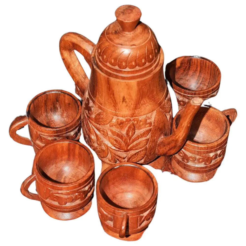 Handcarved Wooden Kettle & Cup Set Decoration Piece