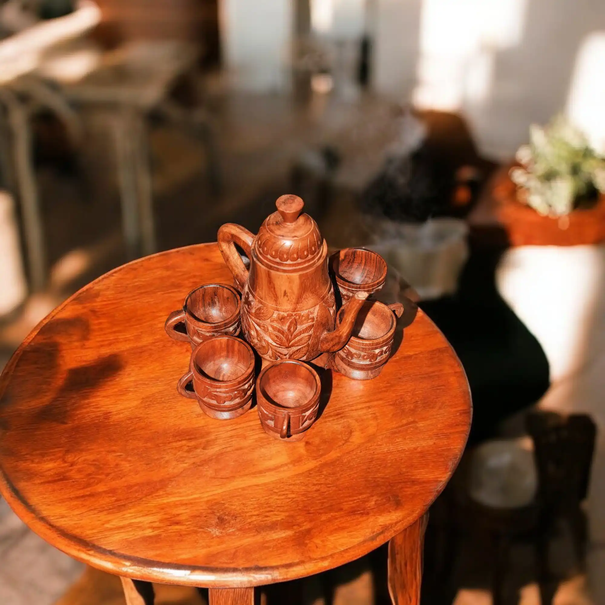 This isn’t for pouring. It’s for remembering. A seven-piece carved wooden set that holds the shape of old kitchen talk and slow afternoons. The kettle and cups carry soft leaf patterns, done by hand, etched into warm brown wood. It rests easy on a table, a shelf, or next to books in a study. Nothing loud. Just a quiet nod to time when things were passed around — not just drinks, but stories.
