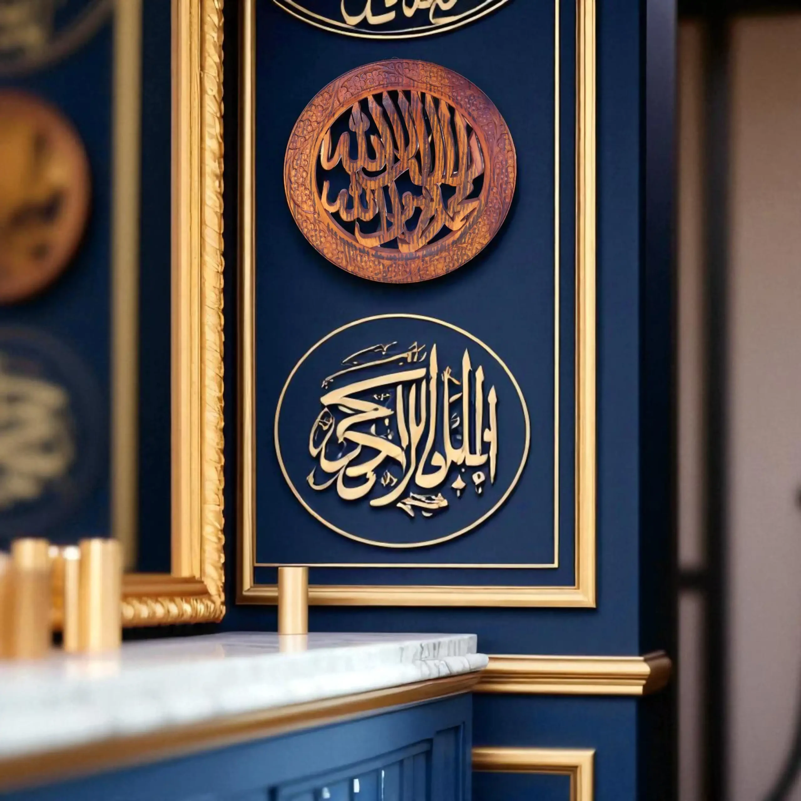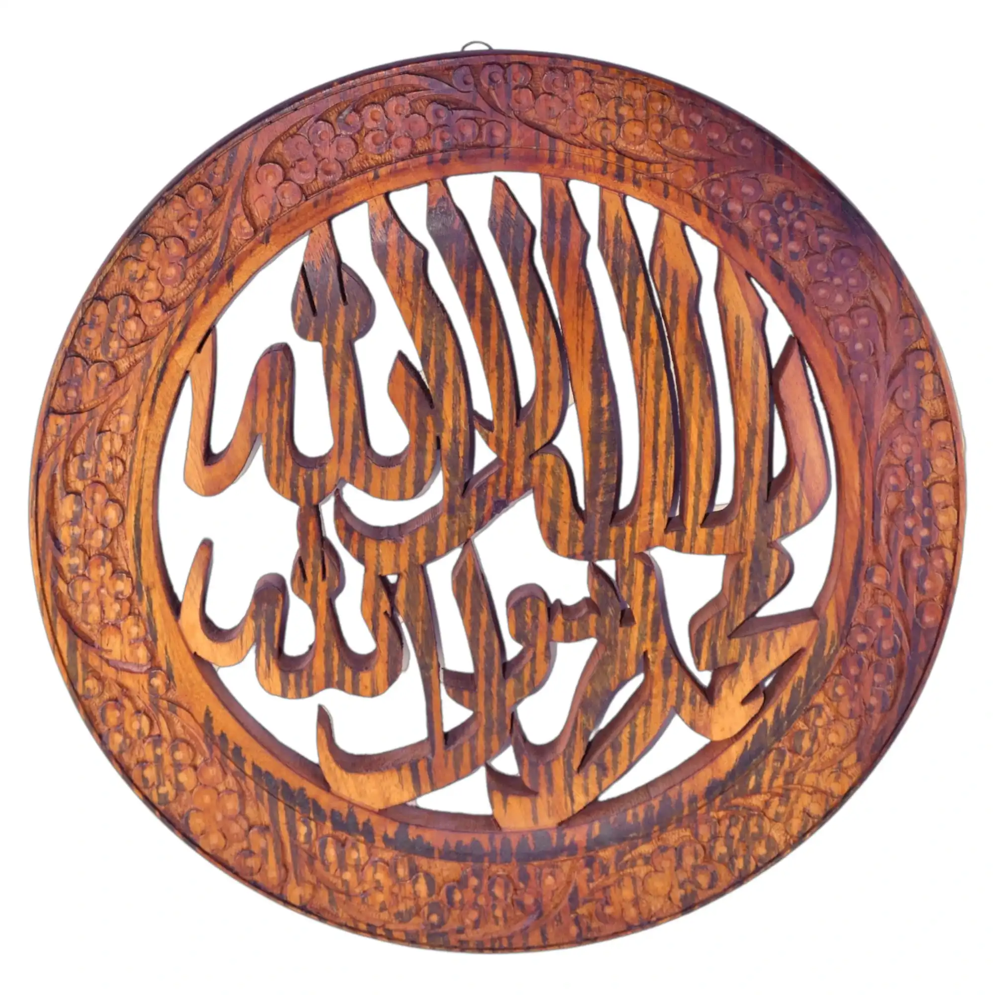 Classic calligraphy in a carved embrace. This wall hanging features the Kalma Tayyaba in full — finely sculpted from one slab of Sheesham and framed in fruit-laden floral patterns. The oval shape gives it presence without being overpowering. It sits well above mantels, shelves, or hall entries. Not ornamental — meaningful. Wood that speaks.