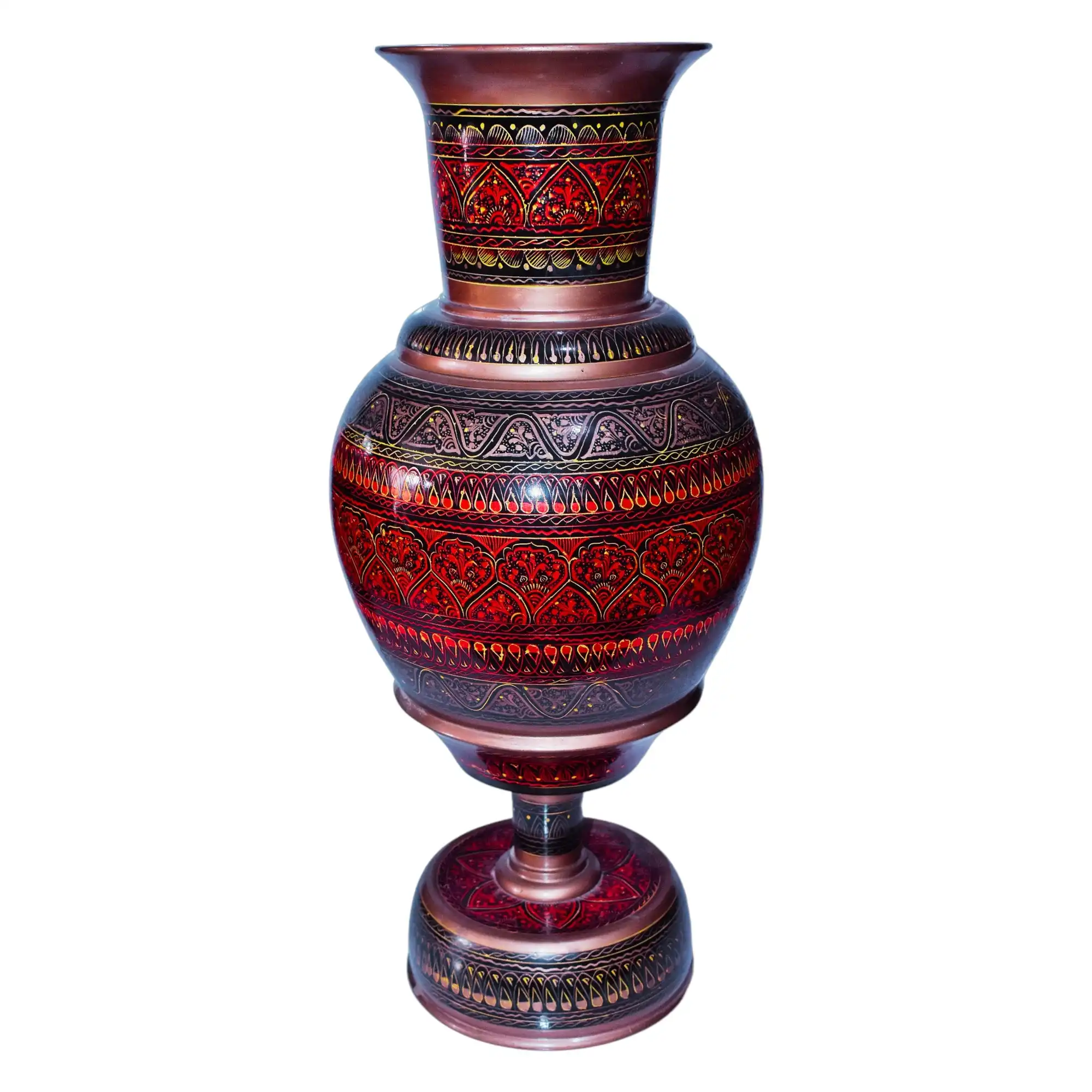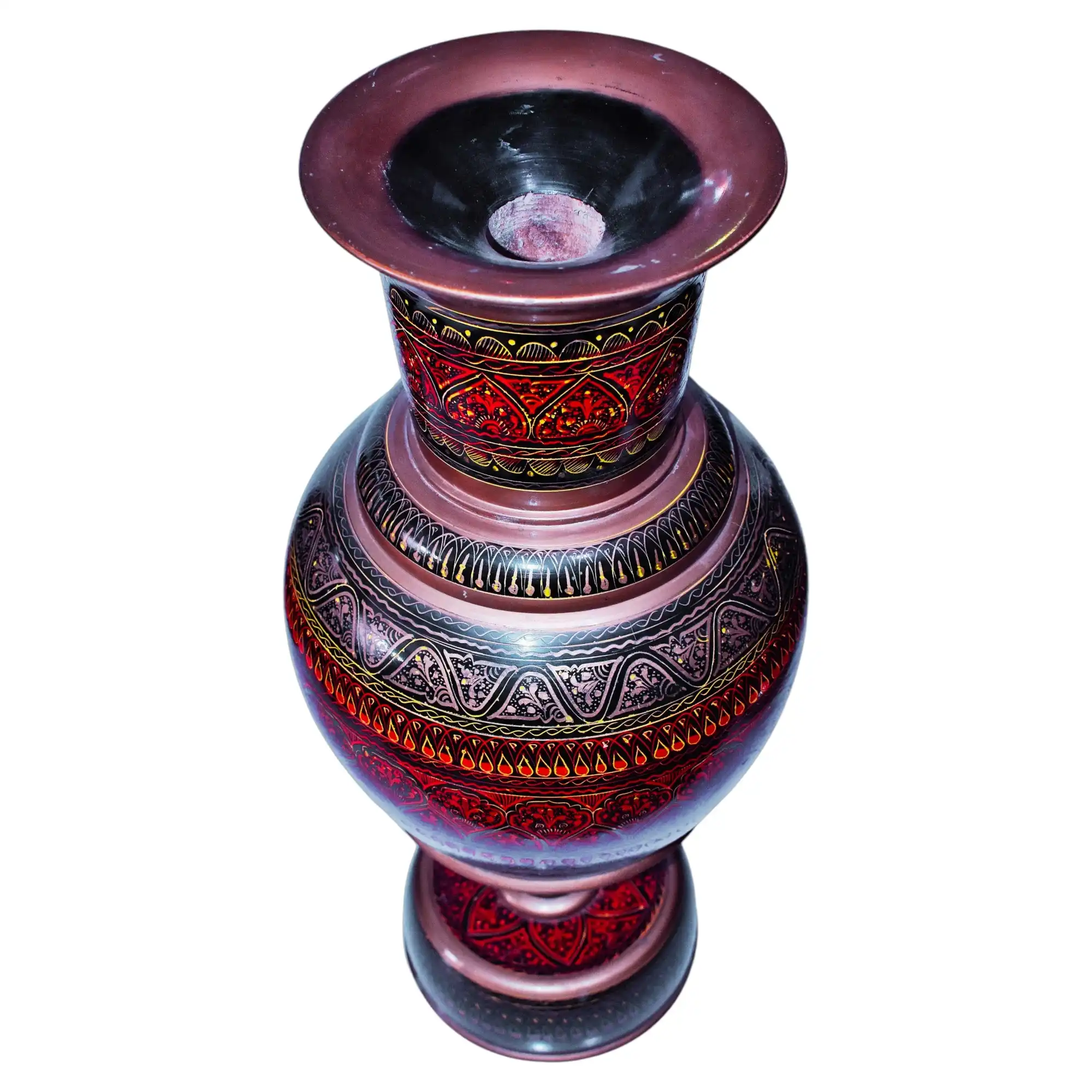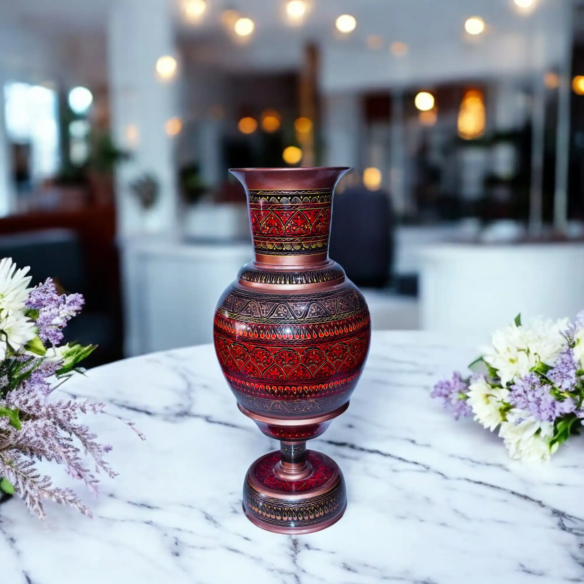 Bold. Regal. Timeless. This 18.5-inch tall metal flower vase stands as a statement of legacy and craftsmanship. Its body is adorned with intricate floral naqshi motifs in shades of deep red, black, and gold, invoking the spirit of Mughal artistry. Each pattern is meticulously hand-done, layered with a lustrous lacquer that brings out its rich detailing. Whether gracing your living room center table or an office corner, this vase commands admiration with grace. No two pieces are exactly alike—this is a true heirloom of our artisan heritage.