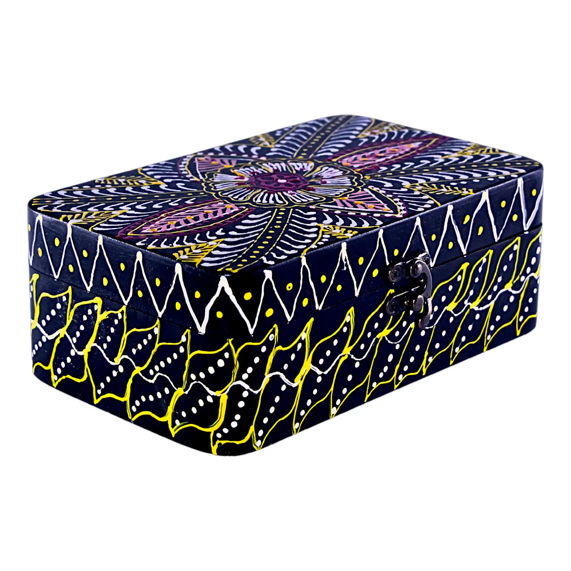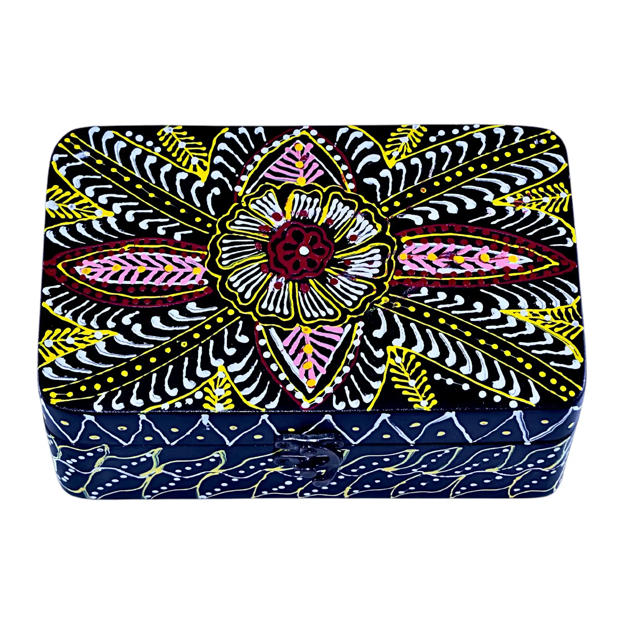 - Mandala-style floral motif on lid in mustard yellow, crimson red, pink & white