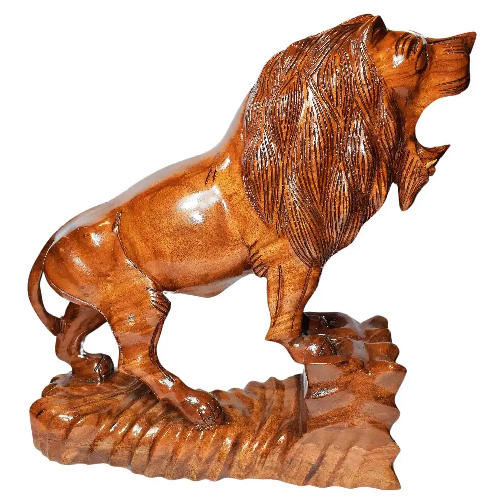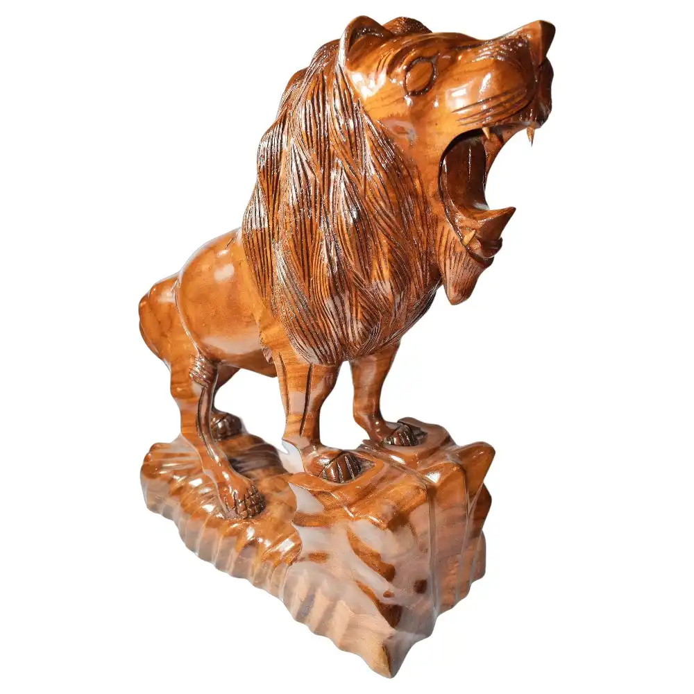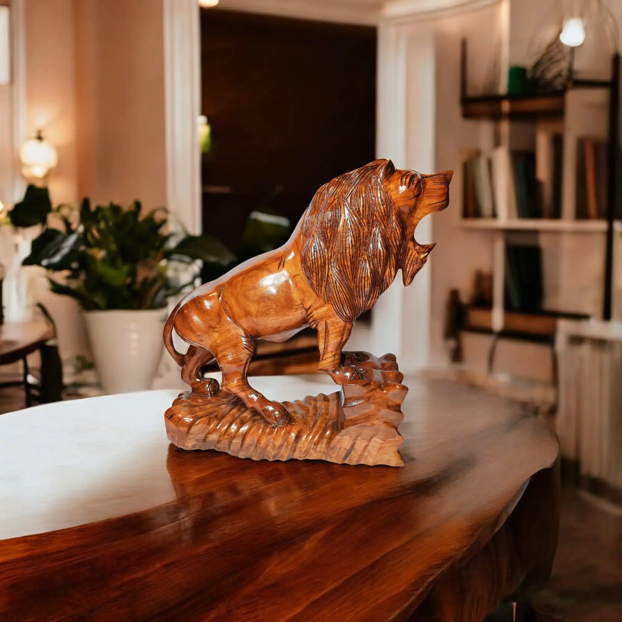 Not loud. Not to scare. But to remind. The lion stands on wood that looks like ground carved by storms. The mane is not wild—it’s deliberate. The body holds weight, not movement. And the eyes? They don’t just look up. They hold something. Maybe pride. Maybe silence. Maybe something you can’t name. You place this lion where presence matters. Where decisions are made, or respect is felt.