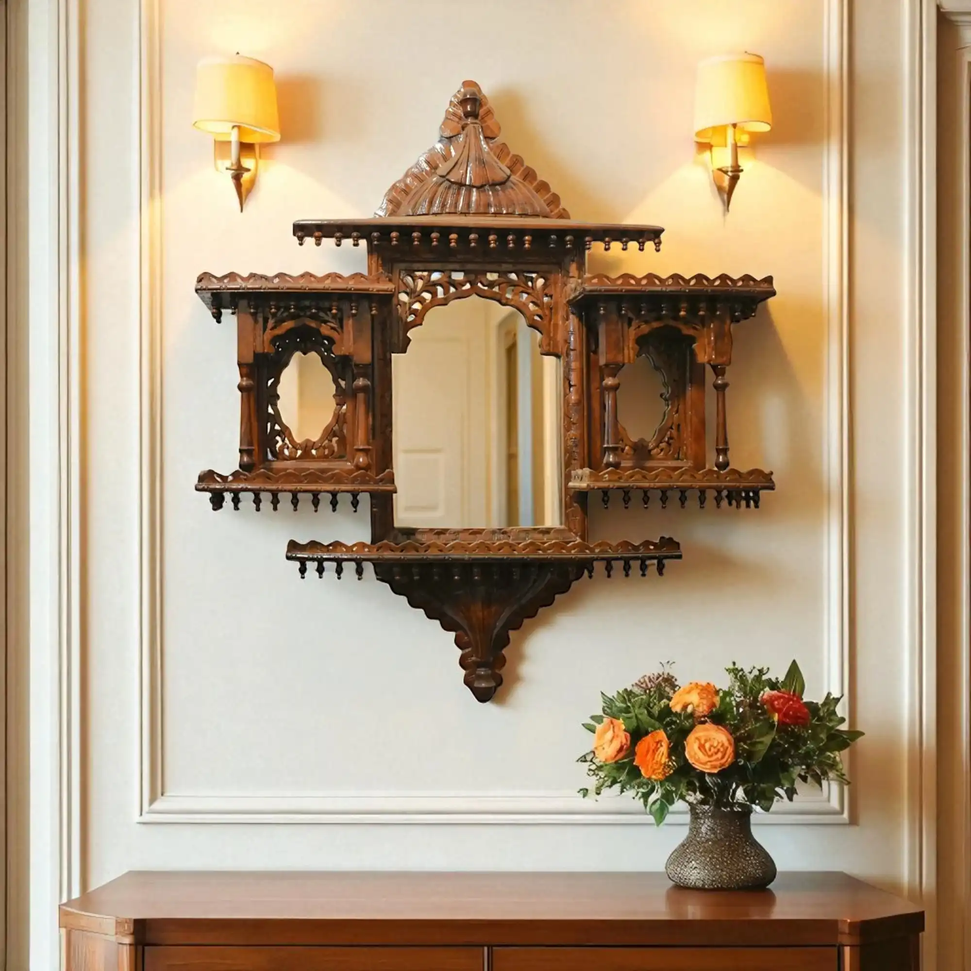 A tribute to the architectural elegance of old palaces, this wooden jharoka is more than a mirror — it is a glimpse into tradition. Hand-carved in solid wood, with archwork and miniature columns on either side, it turns a blank wall into a statement. The center mirror is flanked by alcoves, reminiscent of old haveli balconies. Whether placed in a hallway or living room, it quietly speaks of refinement.