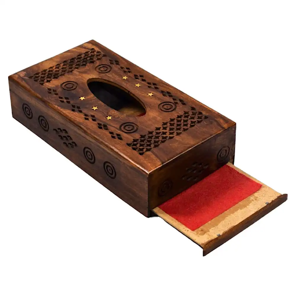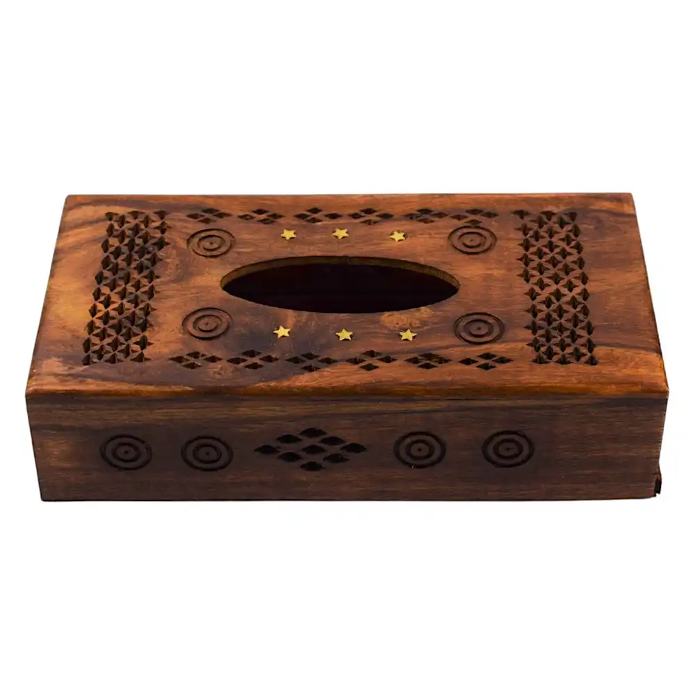 A practical piece with quiet character. This tissue box is carved from solid sheesham wood, detailed with hand-cut patterns and brass star inlay. The base slides out smoothly for easy refilling. Built to last and made to be seen — it holds its place on any desk or tabletop without asking for attention.