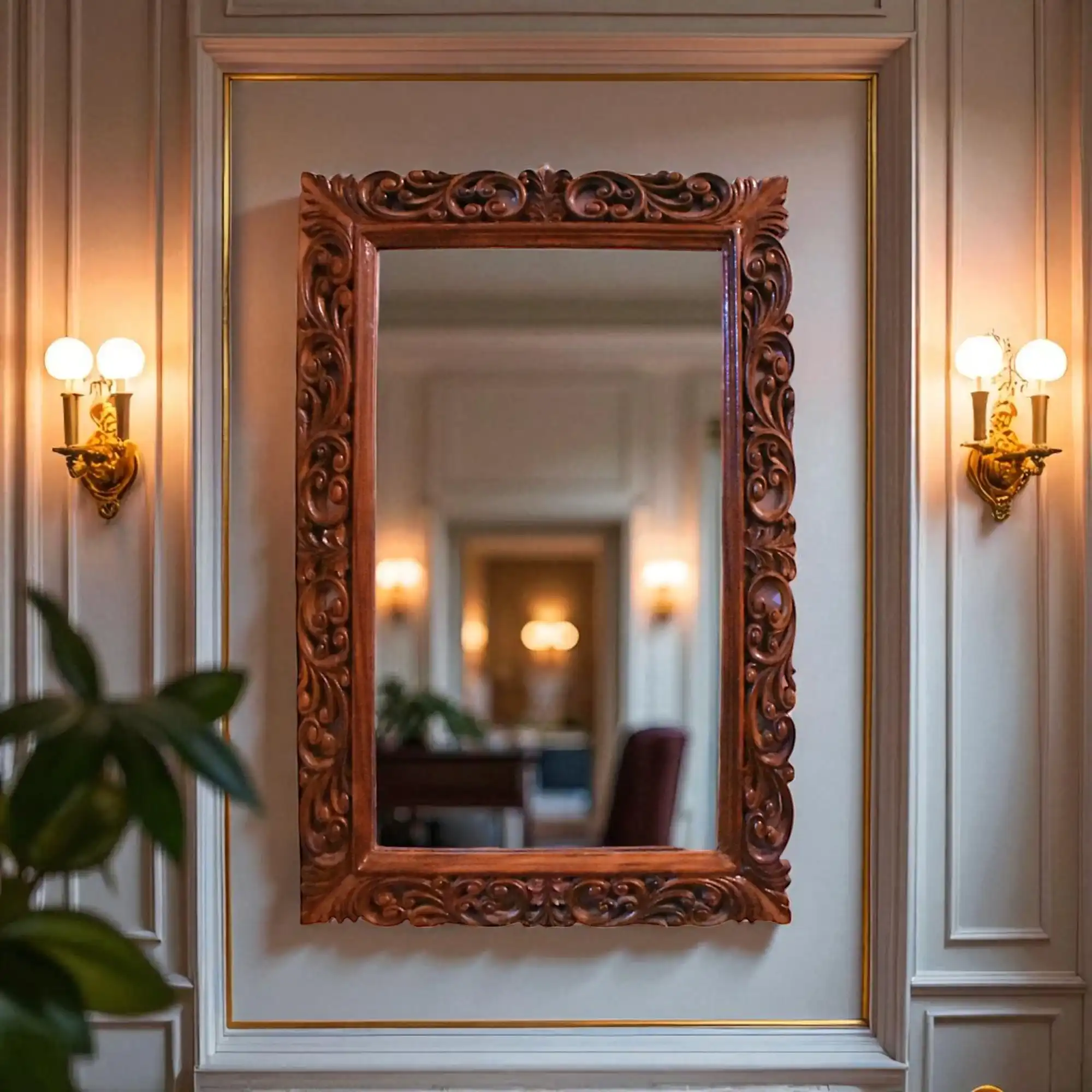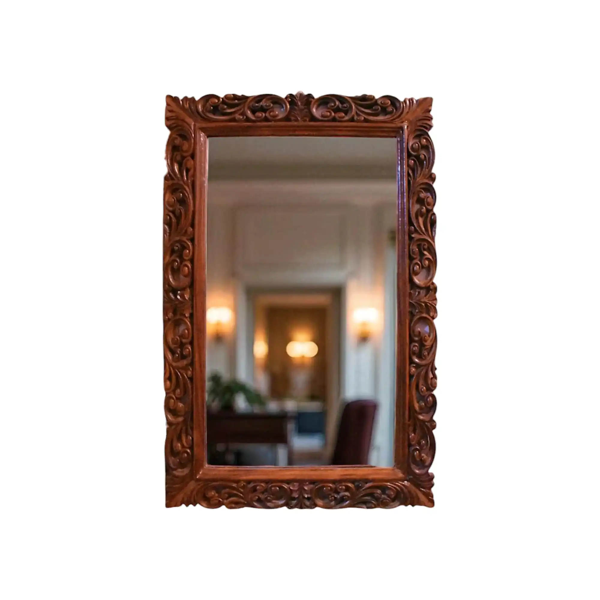 A refined nod to classic Mughal-inspired jharokas, this handcrafted Sheesham wood mirror brings understated heritage to your wall. The intricate carving around the mirror frame isn’t loud—it’s precise. Solid yet elegant, the piece hangs flat against the wall and serves as both a functional mirror and a warm decorative element for halls, living rooms, or entryways.