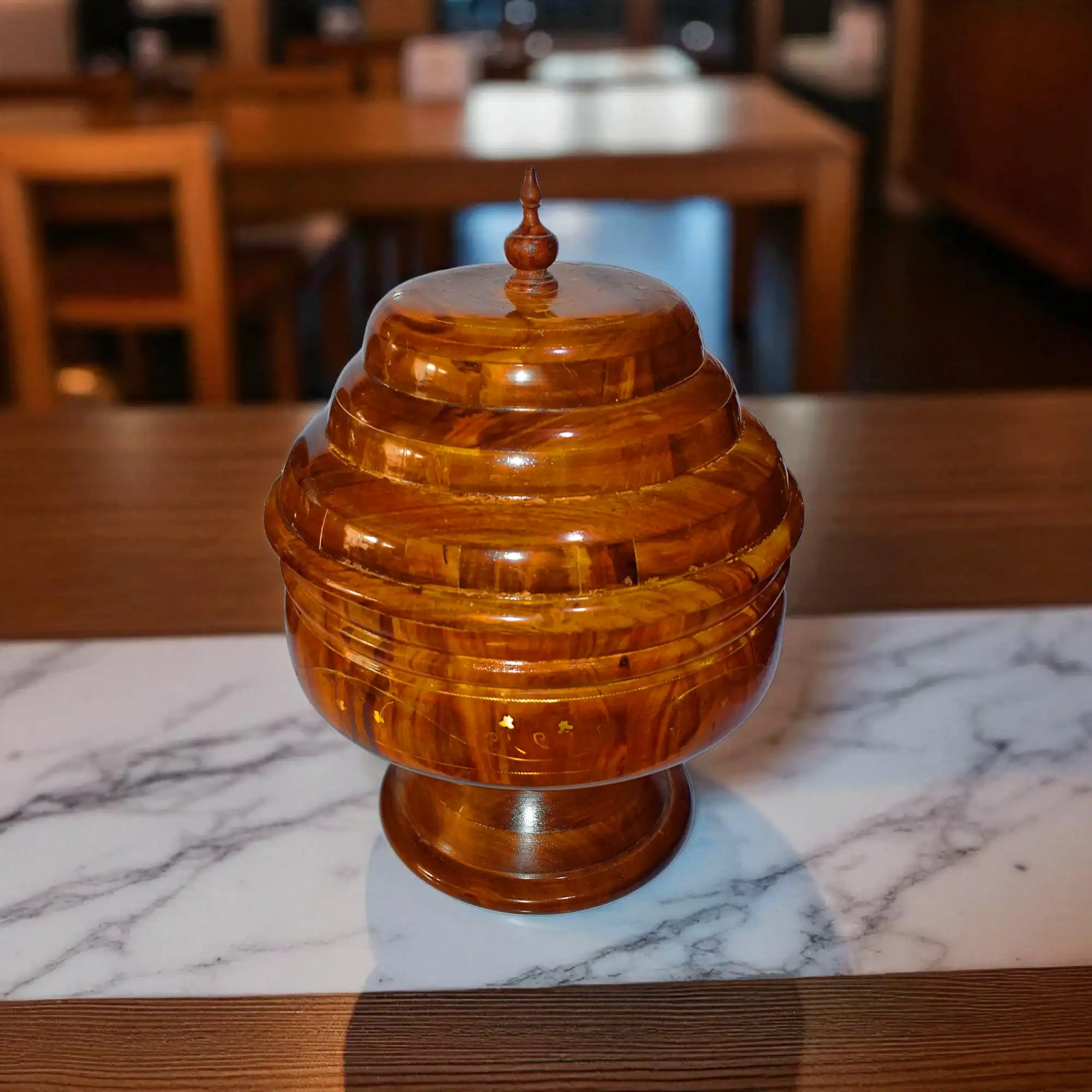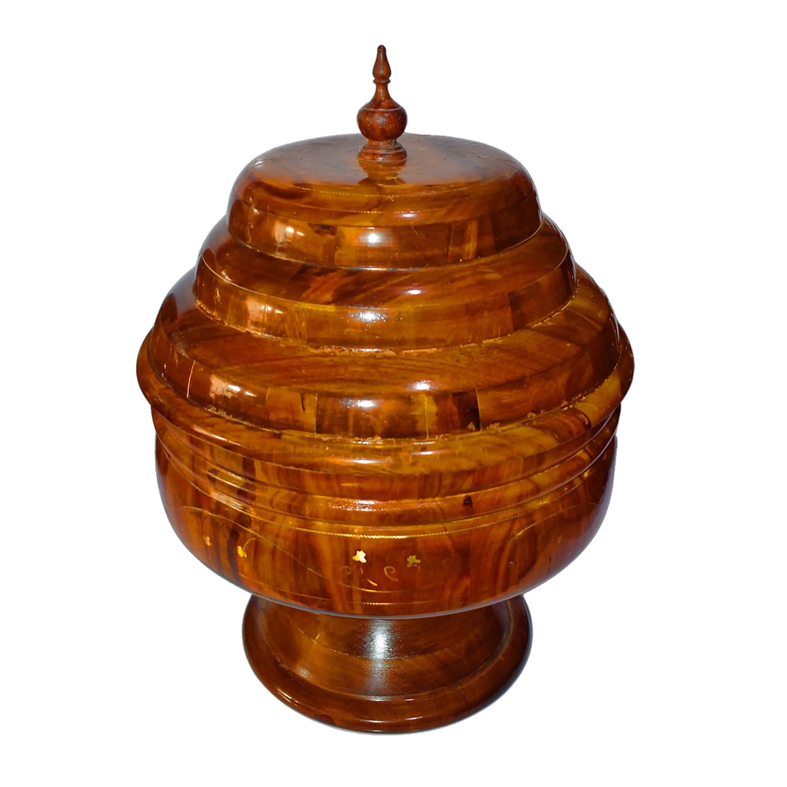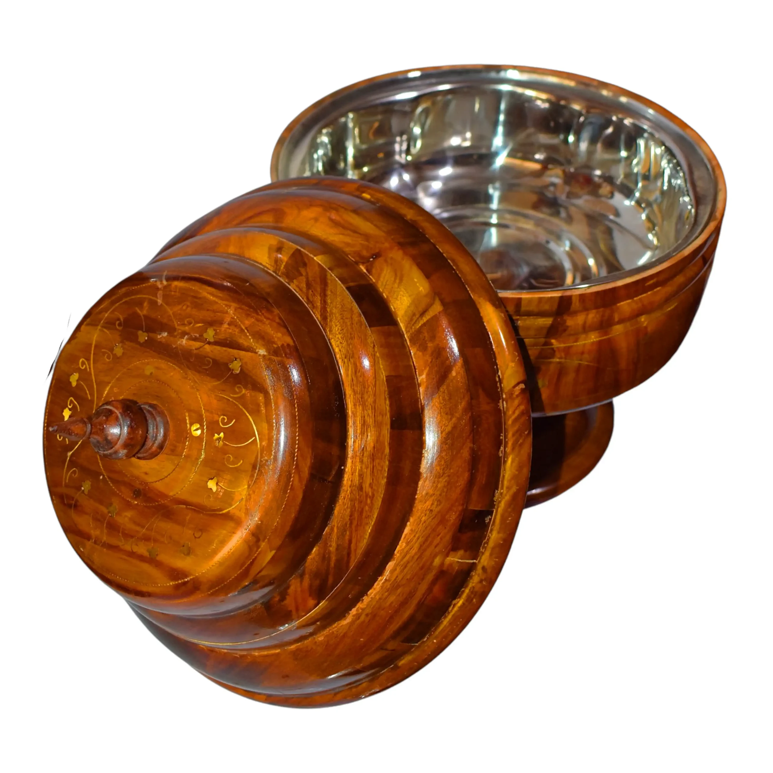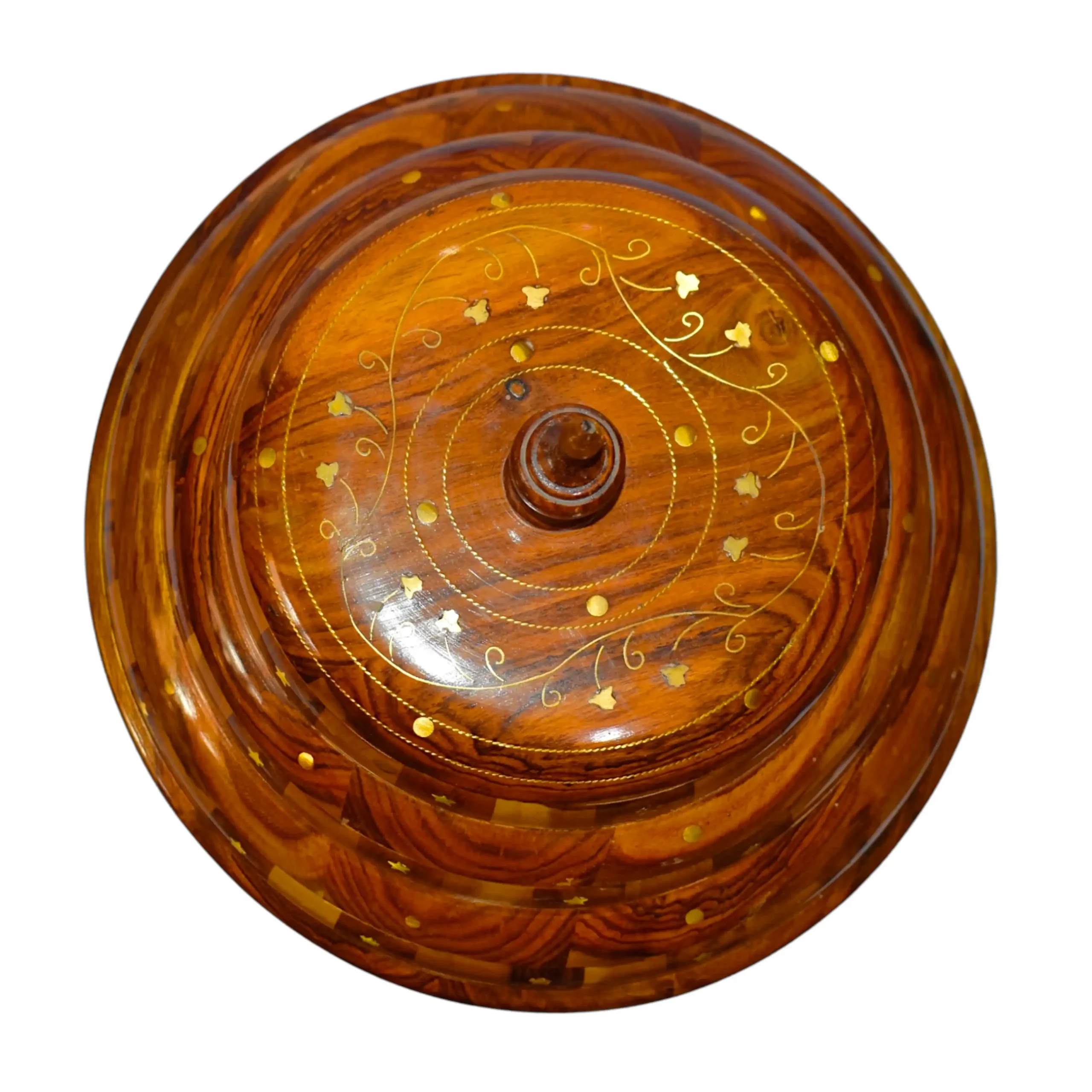This wooden hotpot keeps things clean and straight. The lid has a basic spiral design with small leaf and dot brass accents — no fuss, no loud patterns. Inside, the steel bowl means it’s ready for regular table use — for roti, rice, or whatever’s hot. It stands steady, does the job, and doesn’t try too hard to be something it’s not. Just the right pick if you like plain and useful, with a little desi twist.