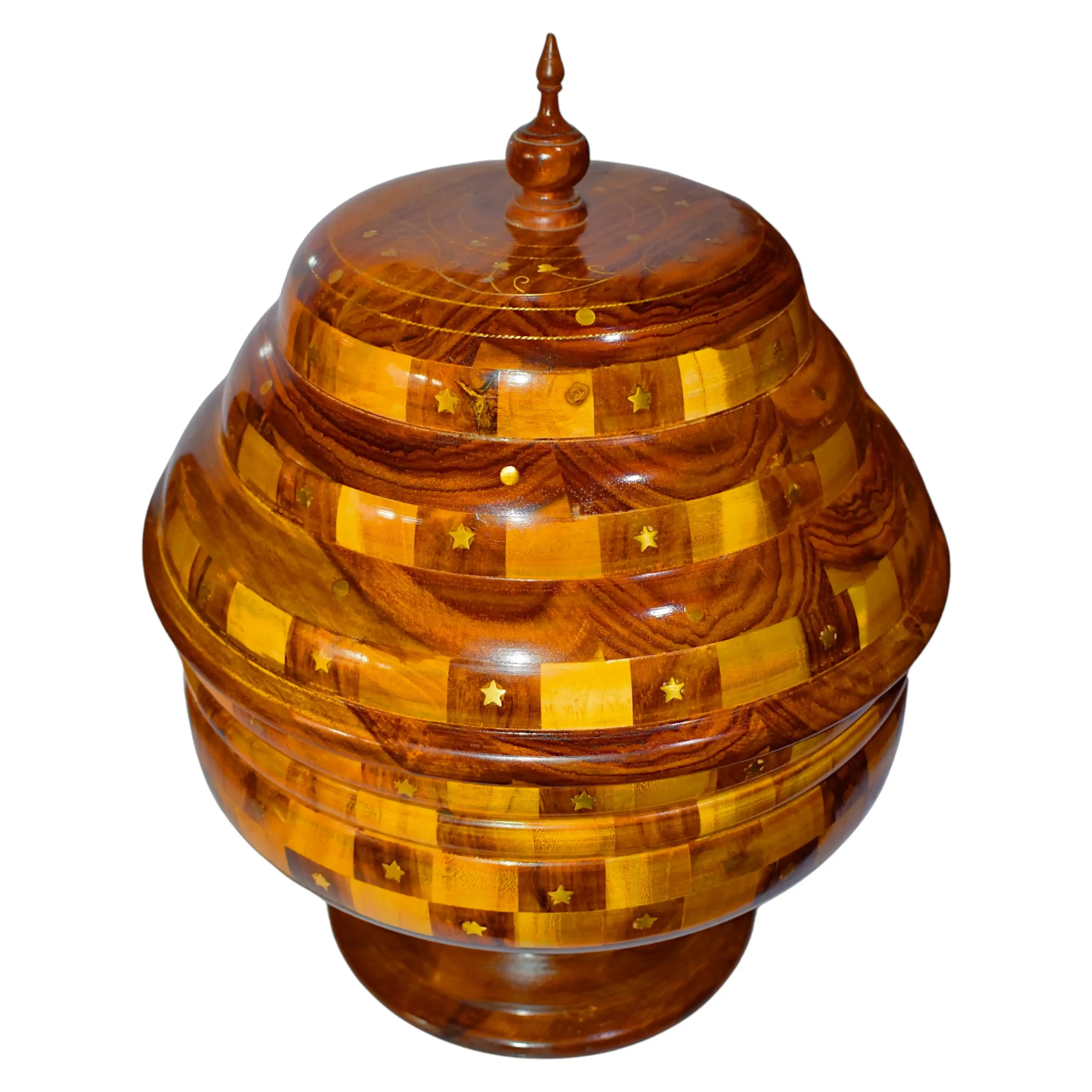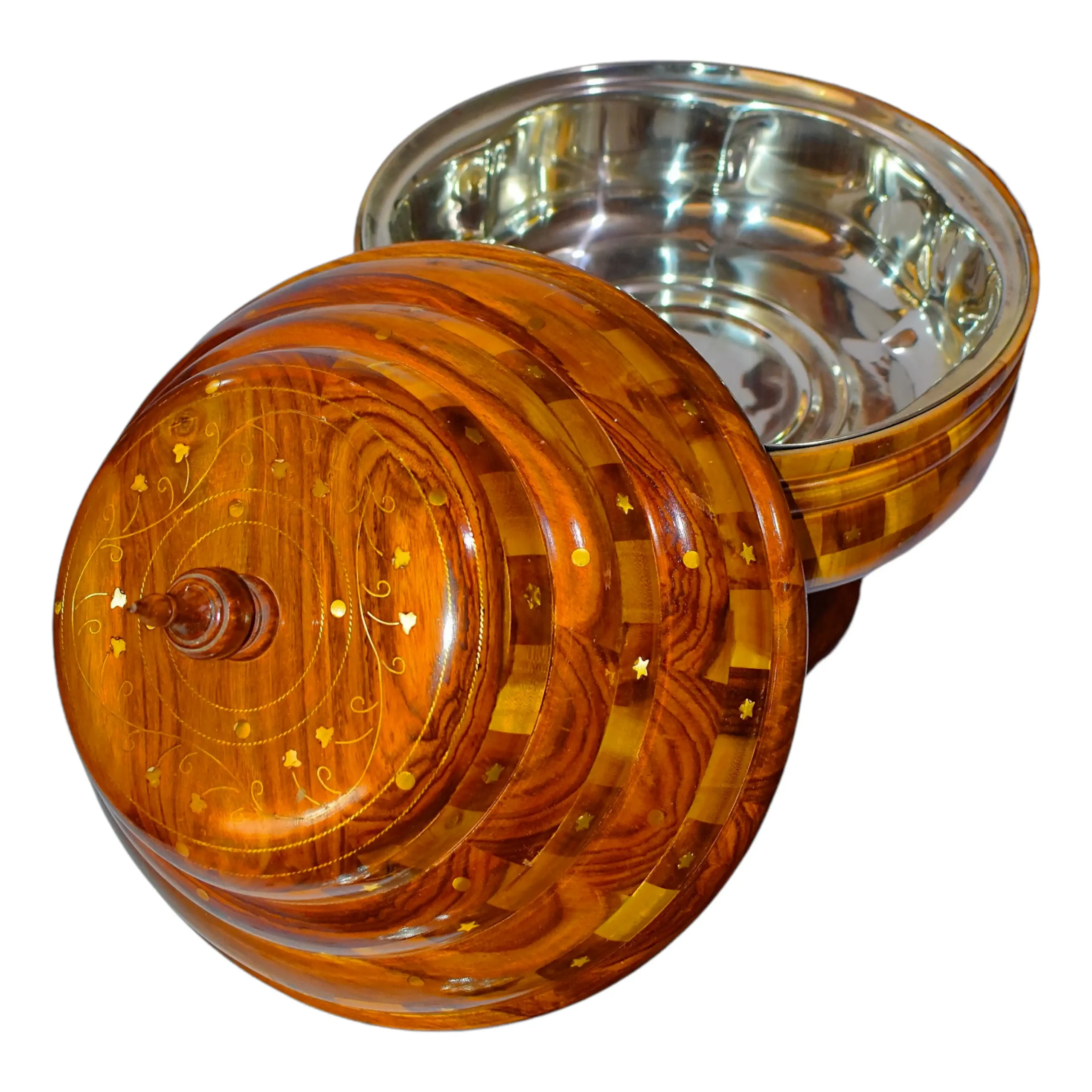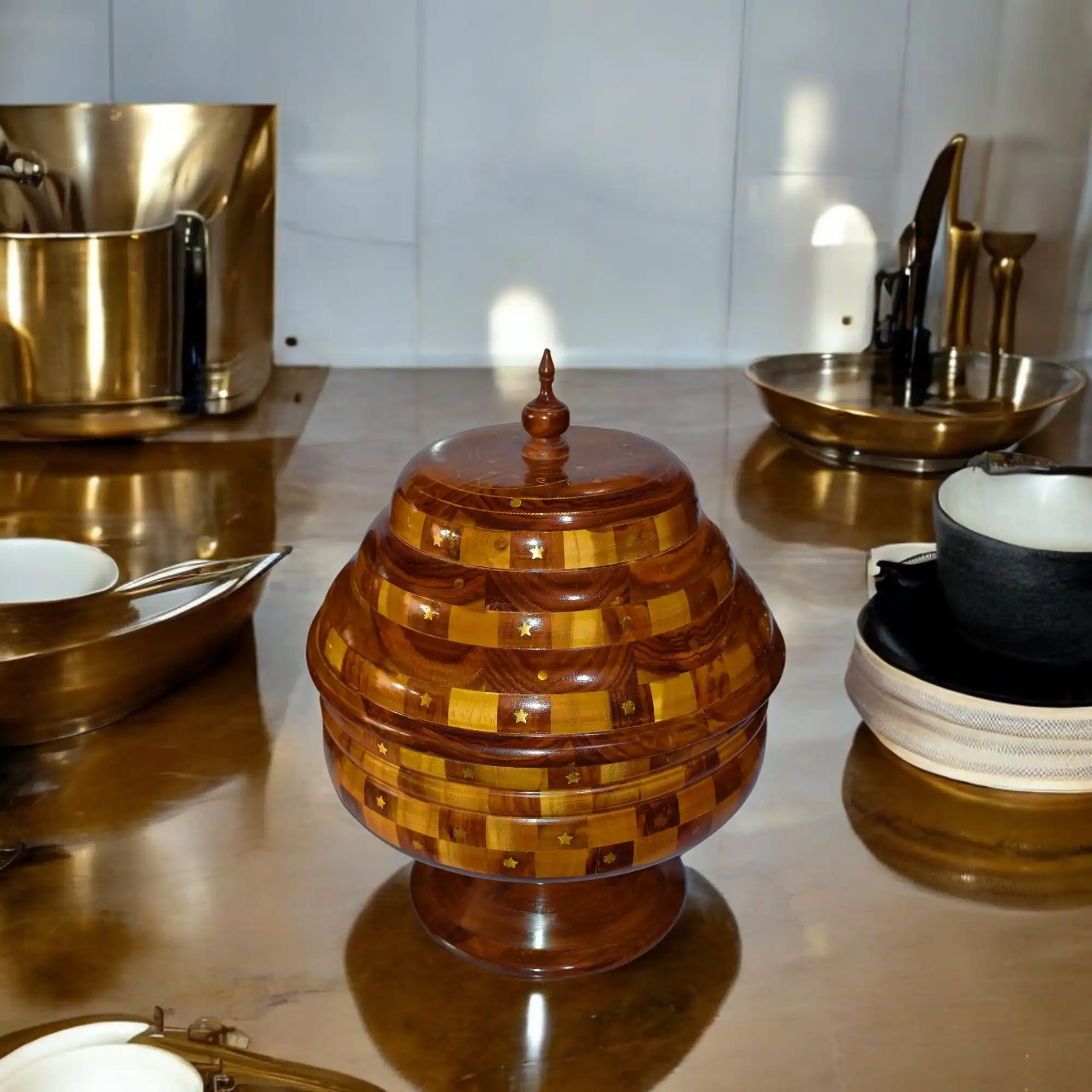 This stepped wooden hotpot takes cues from vintage kitchenware and simplifies them for today’s homes. Its concentric form and tiered lid sit neatly over a sturdy pedestal, designed less for show and more for use. Brass inlay patterns break the repetition, while the inner steel insert holds food temperature longer. The finish is matte-gloss — not too shiny, not too dull. Whether it’s rice or roti, it holds what’s needed. And when not in use, it simply sits well on a counter or shelf without asking for attention.