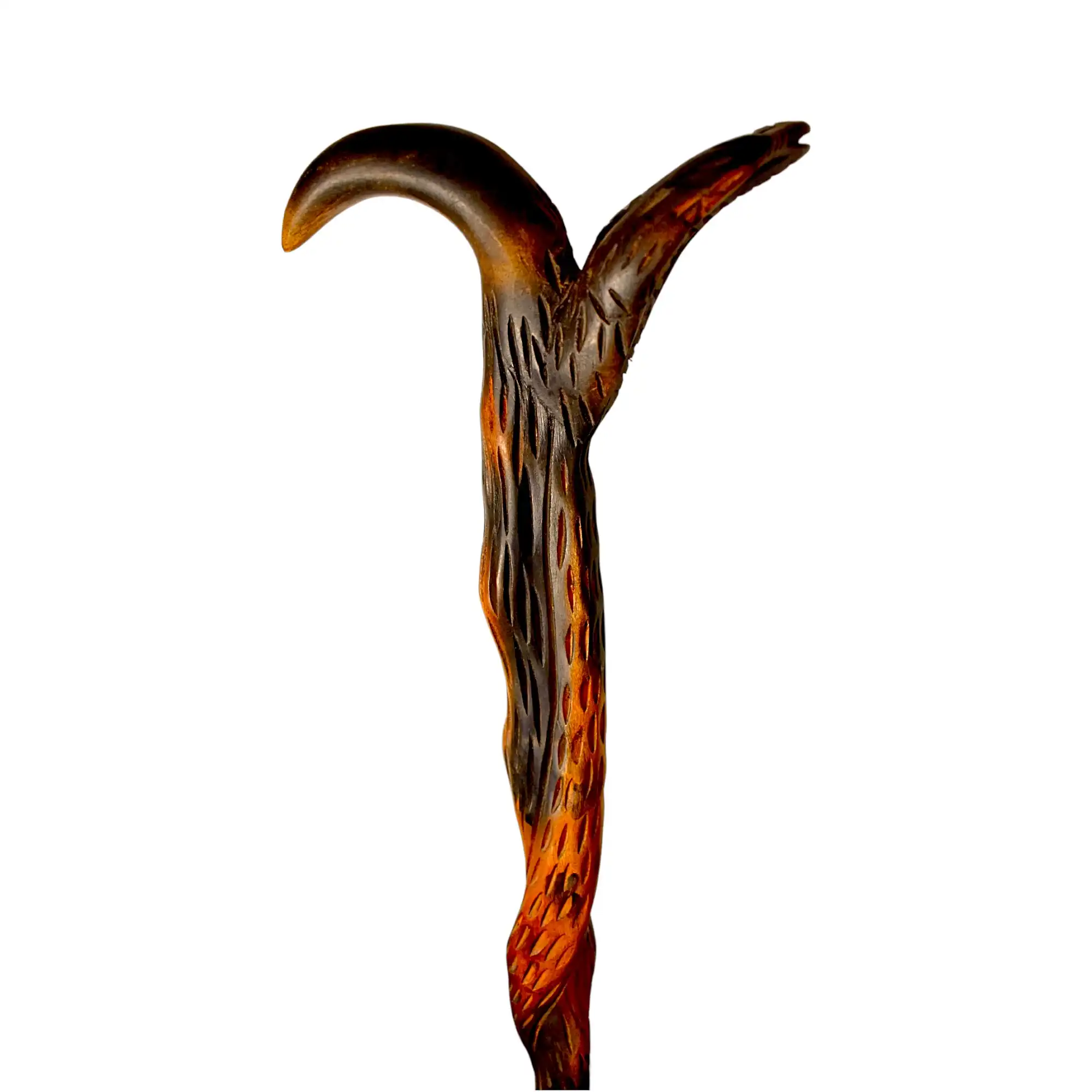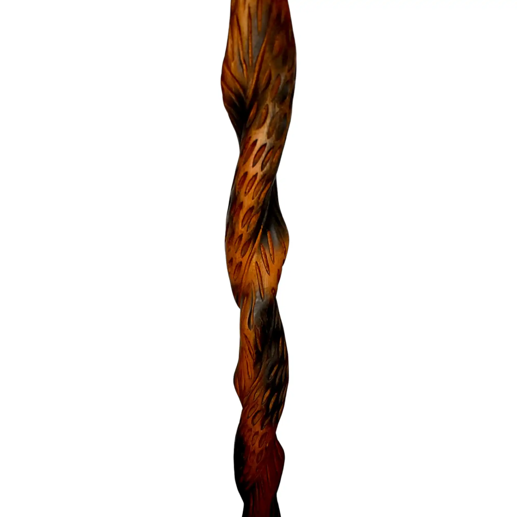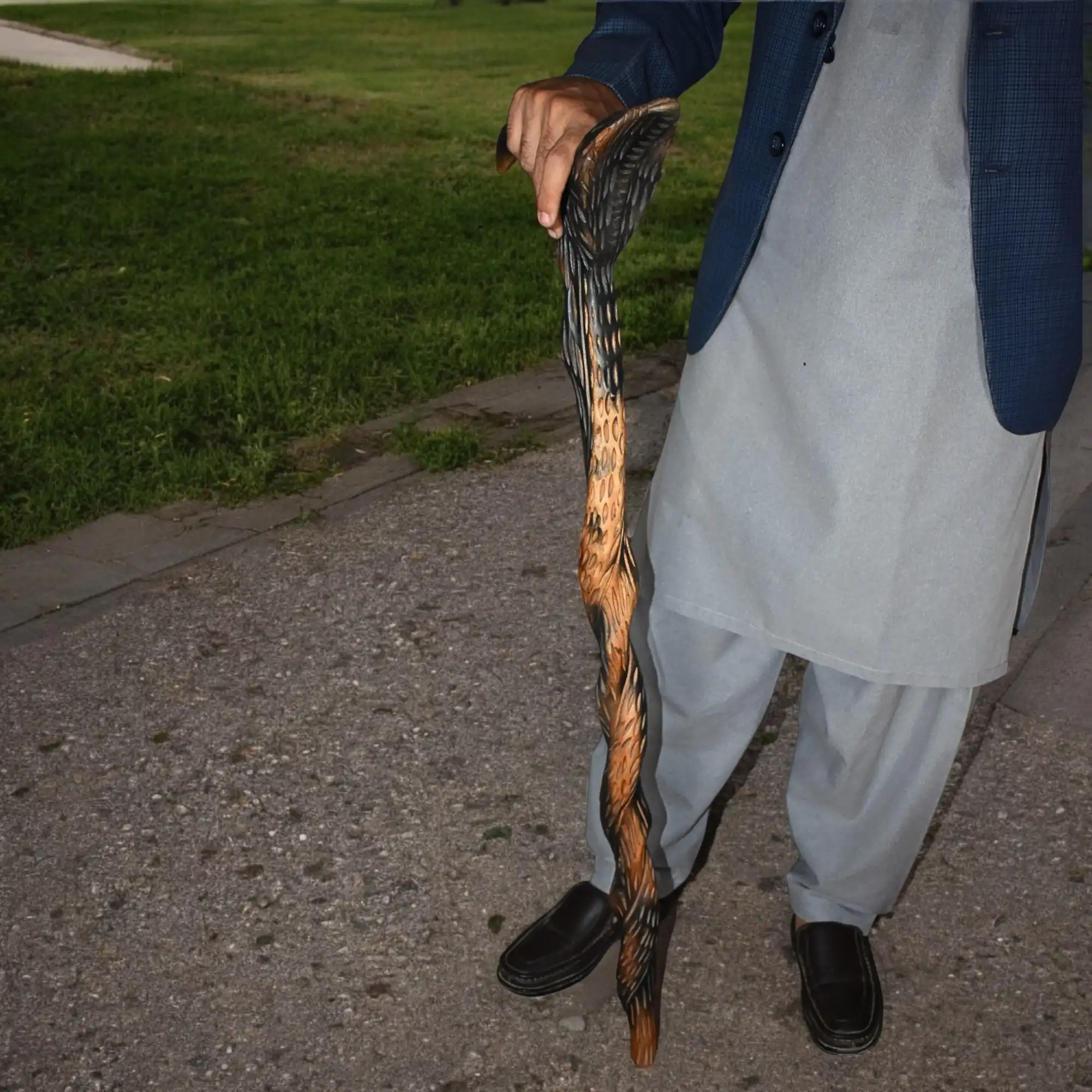 The Twin Fang wooden walking cane is not a tribute to nature—it’s a confrontation. On one side, a cobra’s flared hood coils into your grip. On the other, a hornlike arc curves backward, part hook, part claw. The entire body spirals with hand-burnt veins and primal patterning, giving the illusion of movement even when still.