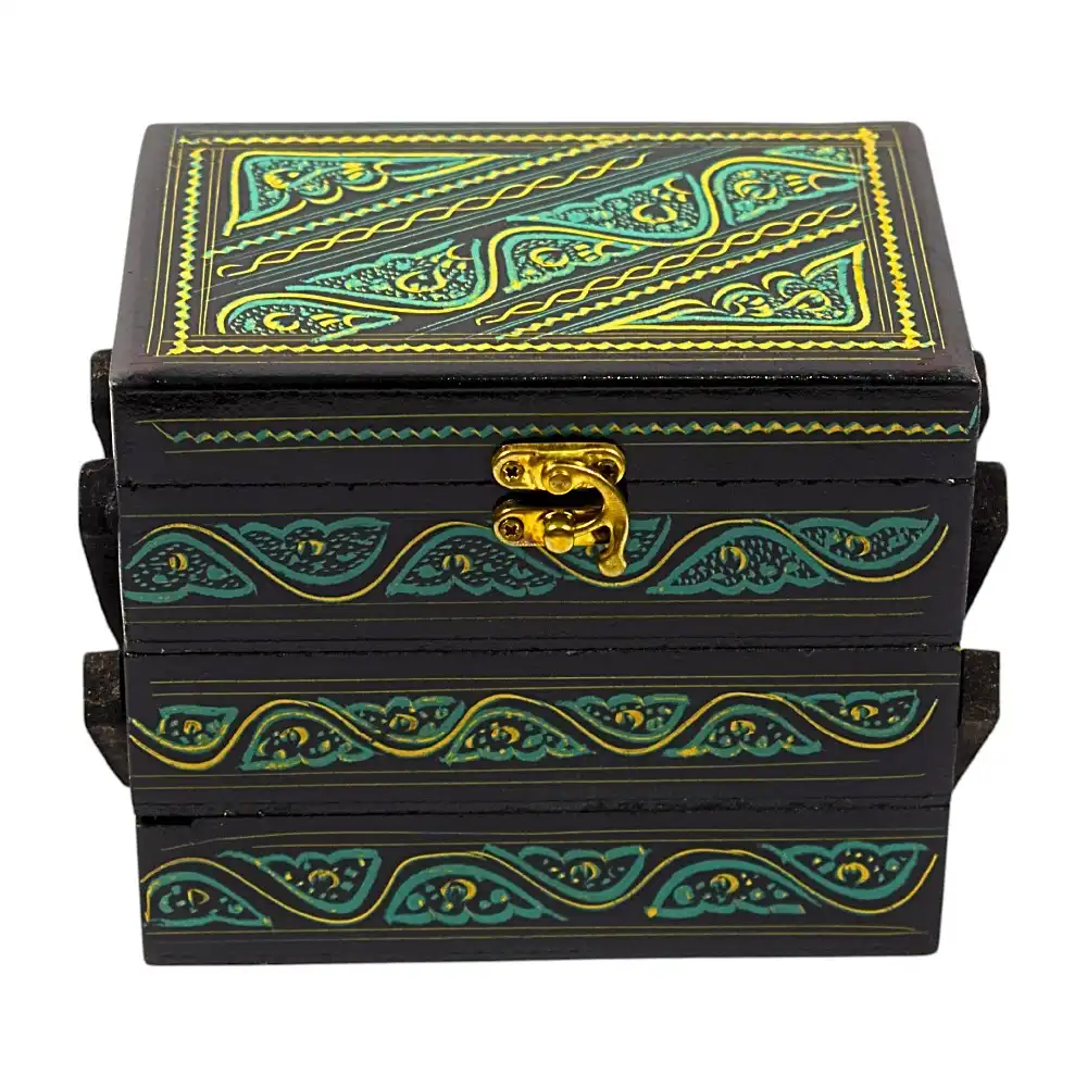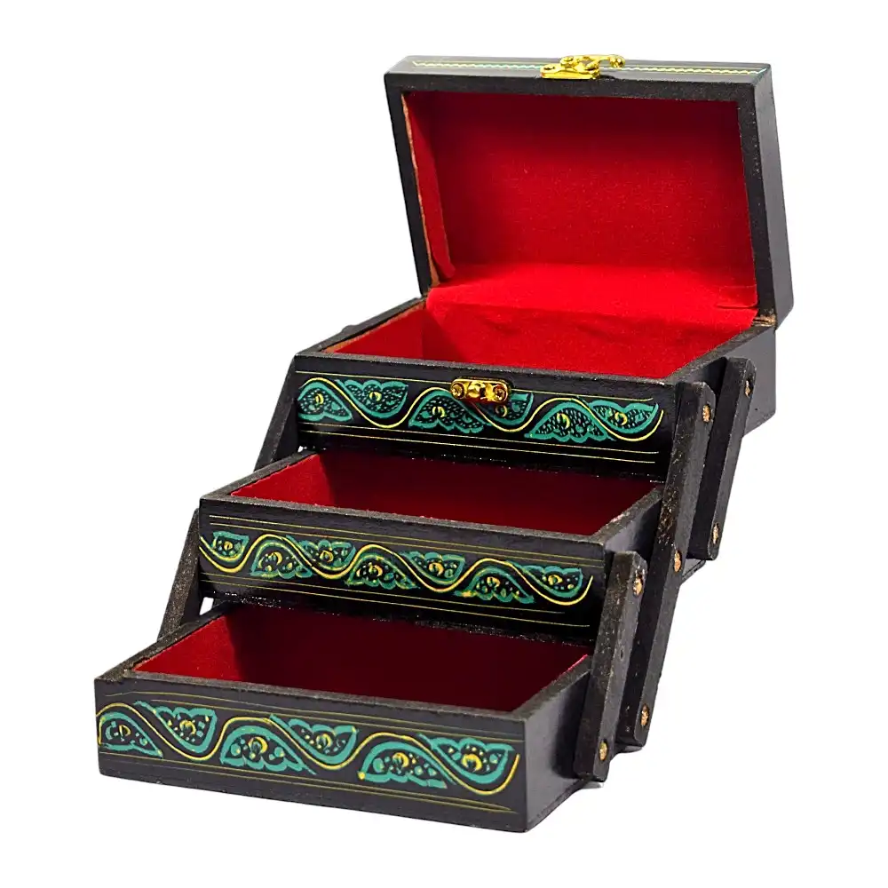 Three-Step Wooden Jewelry Box – Green Naqshi Pattern