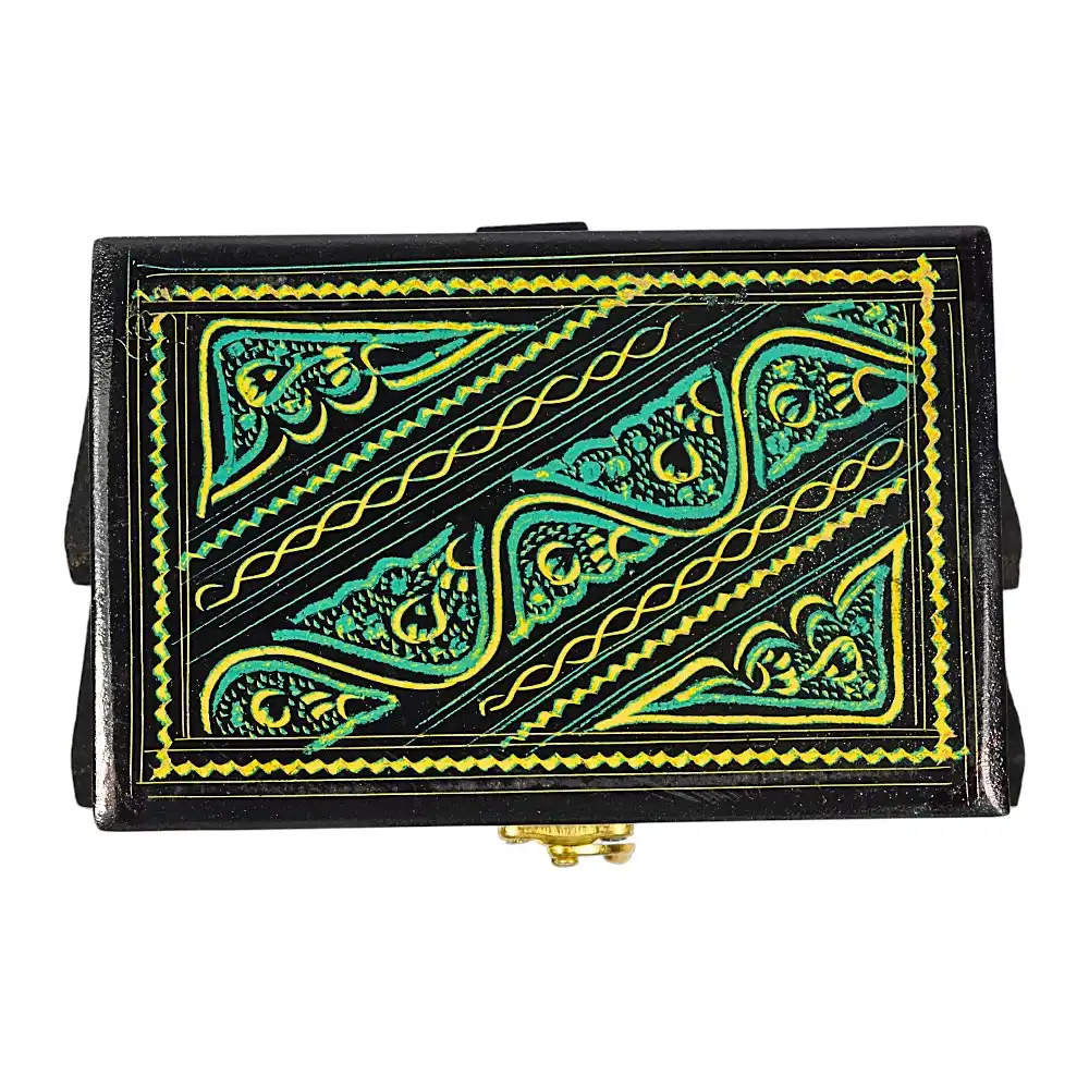 This three-step jewelry box opens with a gentle slide, offering three separate velvet-lined compartments, ideal for keeping different pieces sorted. The surface is hand-painted with a green and gold Naqshi design — a nod to centuries-old craft traditions. It’s simple, sturdy, and looks good just sitting on a shelf or dresser.