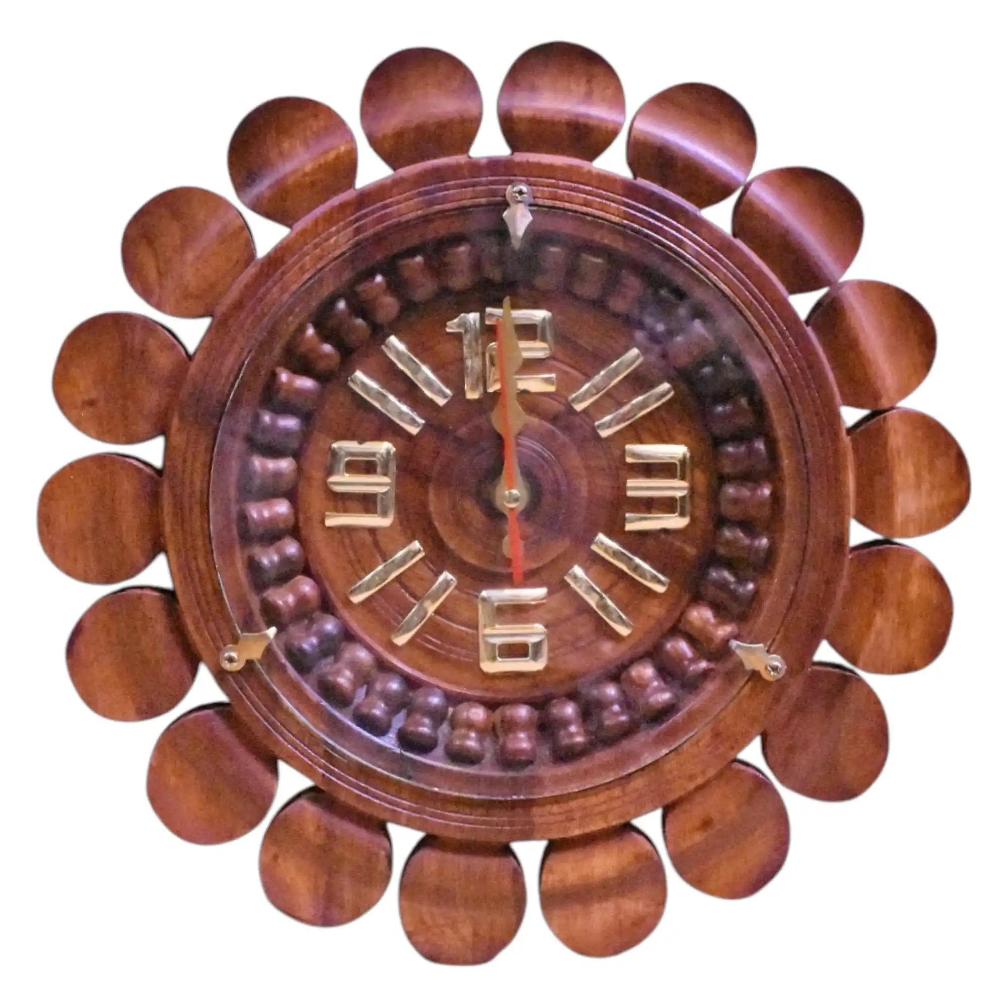 - Handcrafted round wooden frame with petal-inspired outer rim