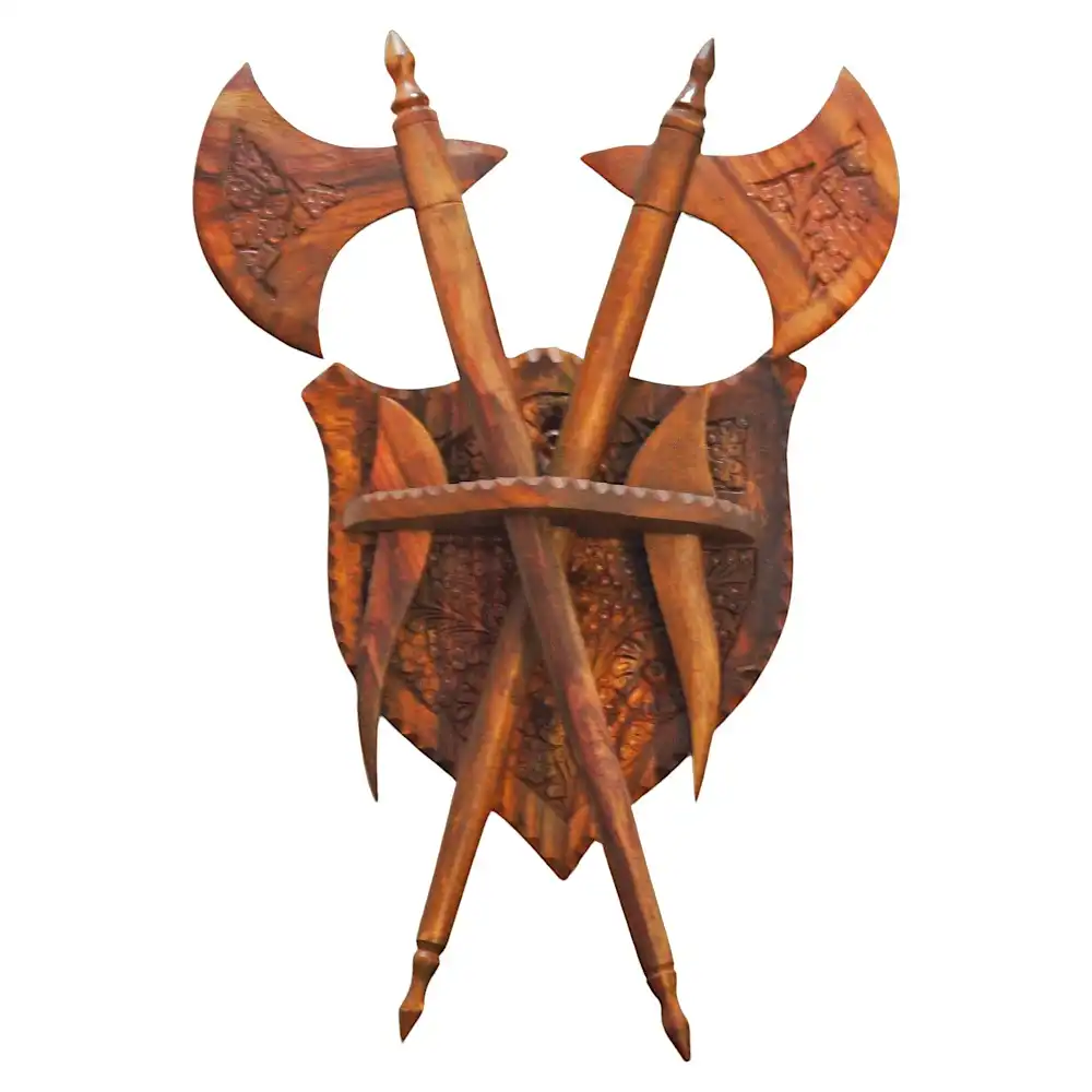 • Hand-carved wooden wall piece featuring 2 battle axes & 2 spears