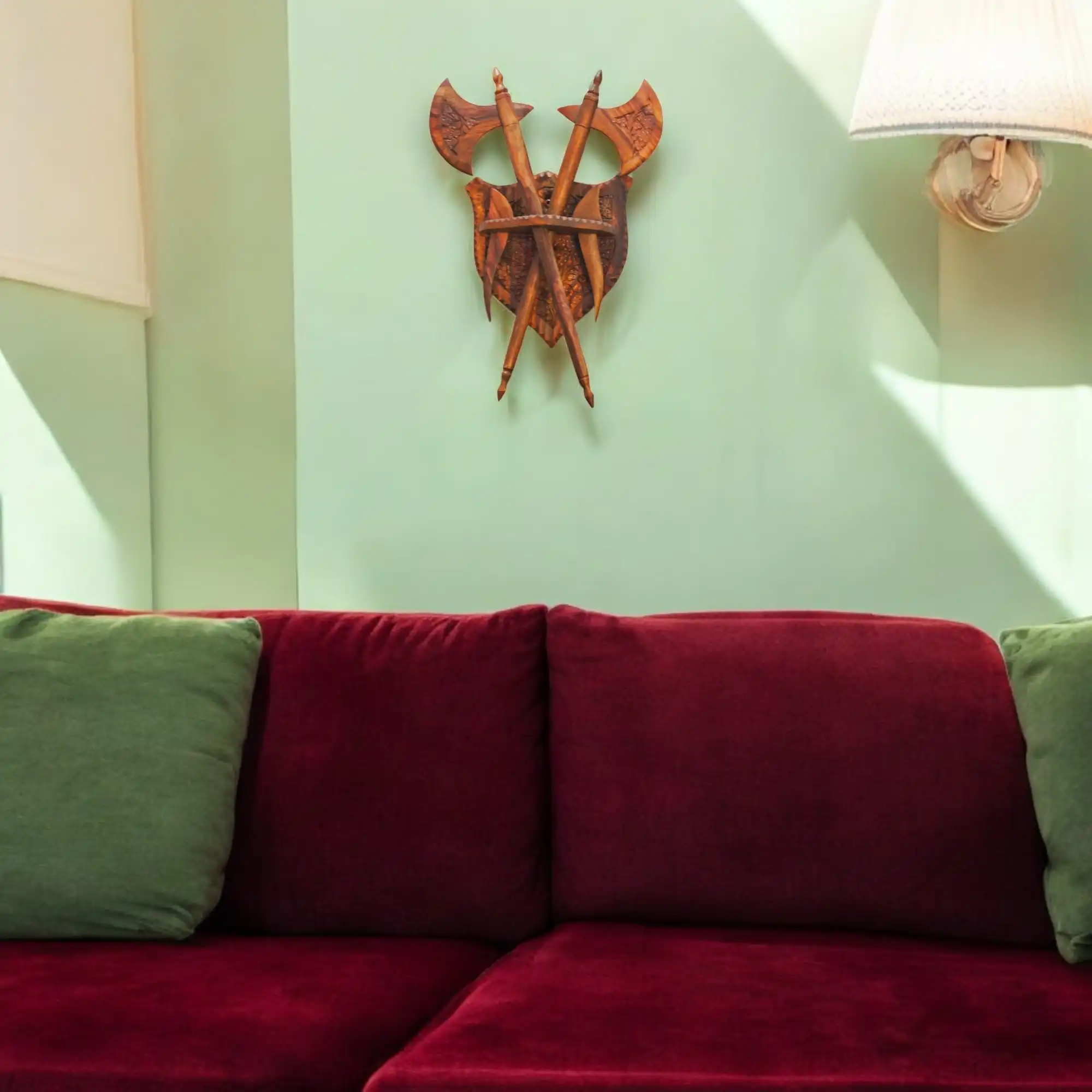 This wooden wall hanging is more than a wall décor – it is a war cry captured in wood. A homage to the ancestral might of warriors, this piece blends ornamental art with functional intrigue. The finely carved battle axes and spears are not fixed; they can be unsheathed and held, reassembled into place like a warrior preparing for or retiring from battle.