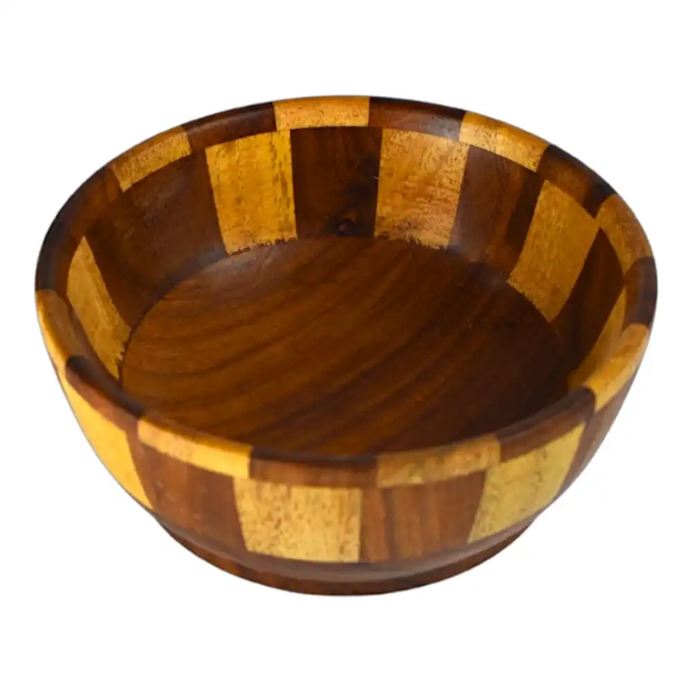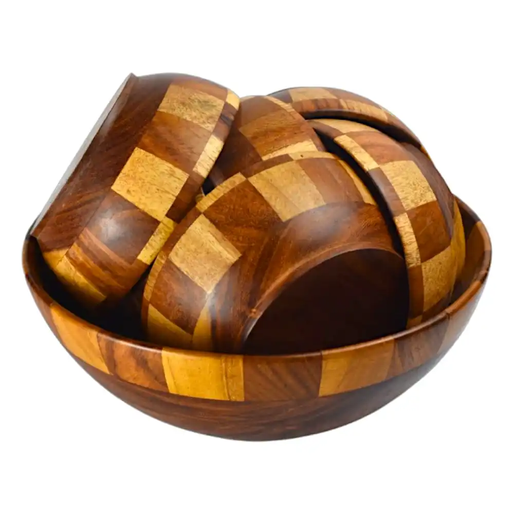 The bowl set blends two native woods—warm acacia and rich rosewood—into a smooth checkered pattern that feels just right. The large bowl serves as the centerpiece; the five smaller ones complete the experience. A functional accent for dry snacks or center-table display.