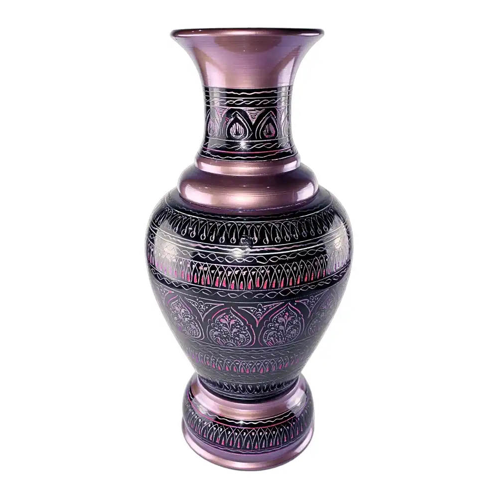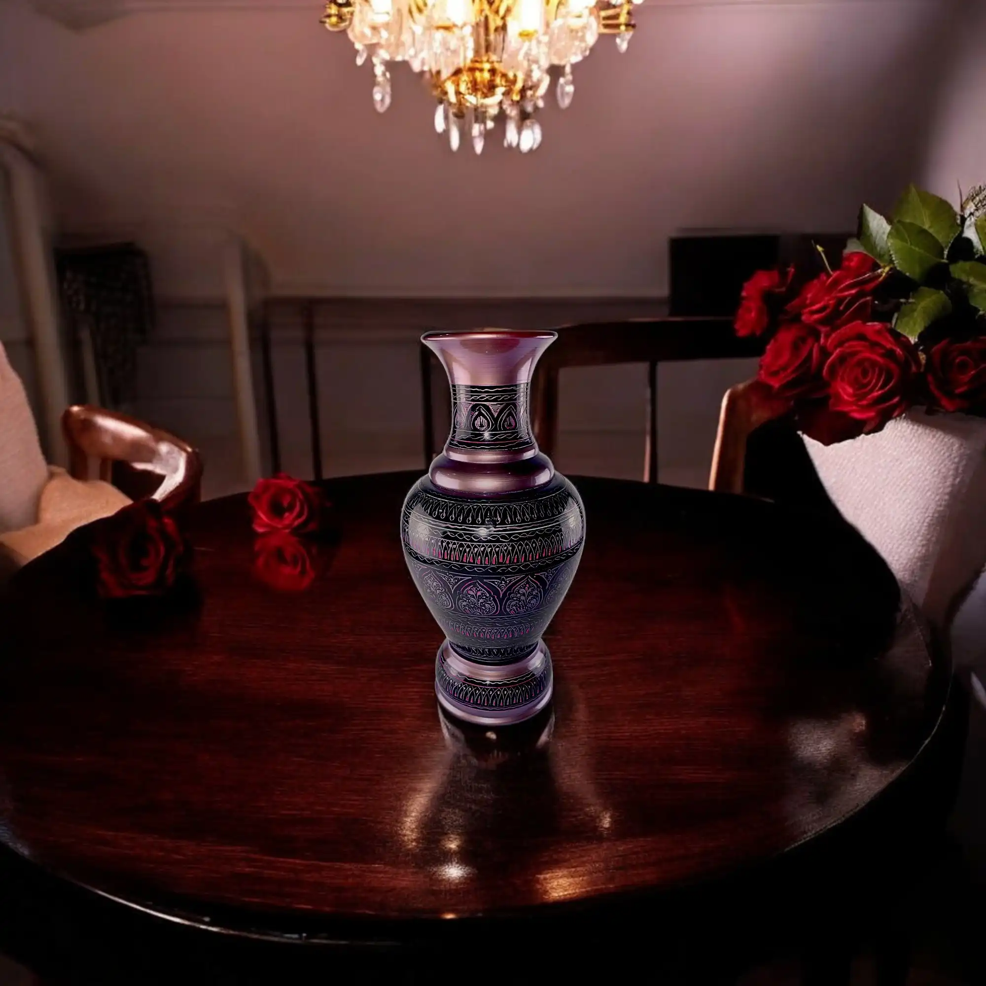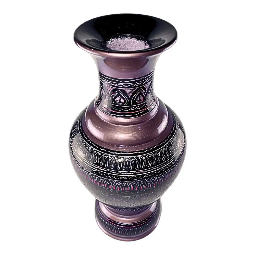 Bold without shouting, this 10-inch wooden flower vase is a quiet marvel of craftsmanship. Finished in a dusky black with silver and pink naqshi patterns carefully hand-rendered, it feels both rooted in tradition and unapologetically current. The high neck and curved belly follow a classic silhouette, while the color palette offers a refined edge.