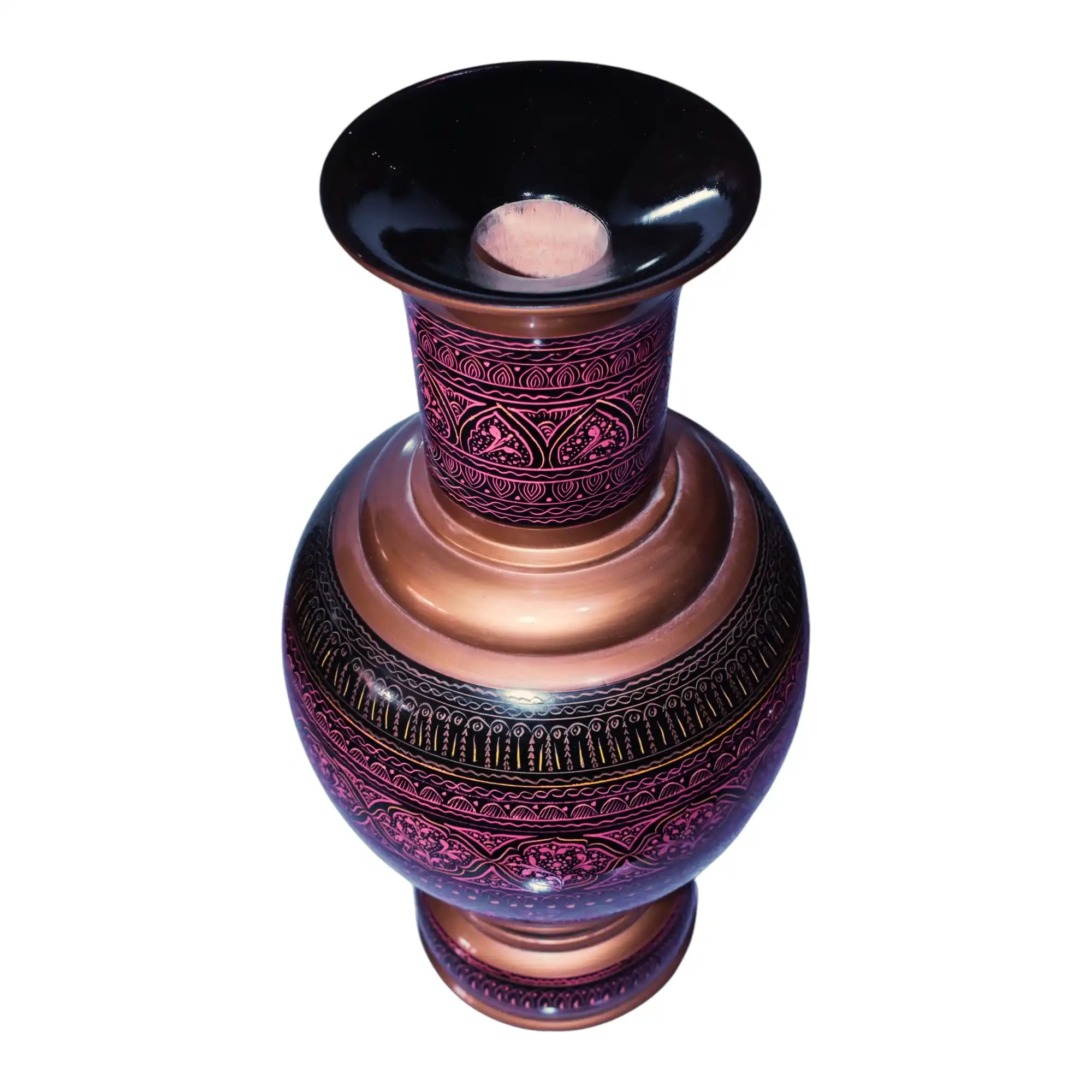 This exquisite handcrafted wooden flower vase showcases traditional naqshi artistry in a stunning copper-pink-black color palette. The body is decorated with floral and paisley motifs, accented with intricate linear detailing that evokes timeless influences. The wide base ensures balance, making it ideal for fresh flowers, dried arrangements, or simply as a standalone decorative centerpiece.