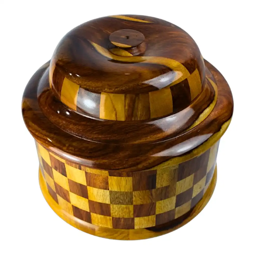 Baaz Mosaic is a modern take on the traditional wooden hotpot. Its checkered wood pattern—alternating between warm light and deep dark grains—gives it a distinct, bold look. The lid is shaped like a gentle dome, easy to lift and designed to hold warmth. Whether you use it for dry food, storage, or simply to place on your table as a piece of character, this piece holds its own quietly. Simple, solid, and rooted in fine woodwork.