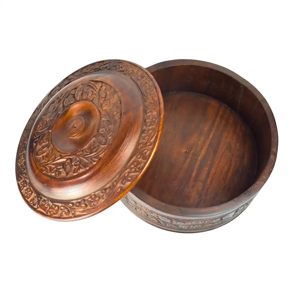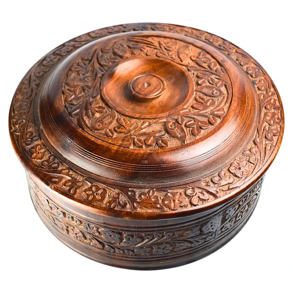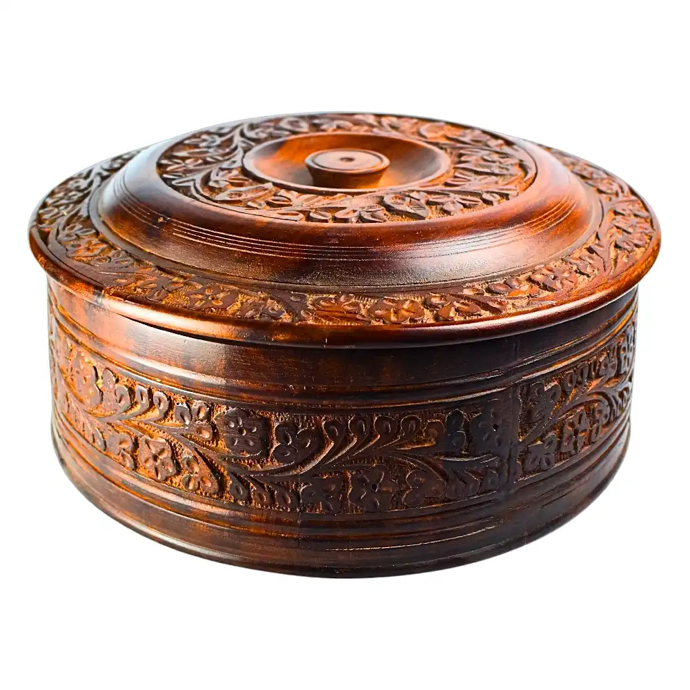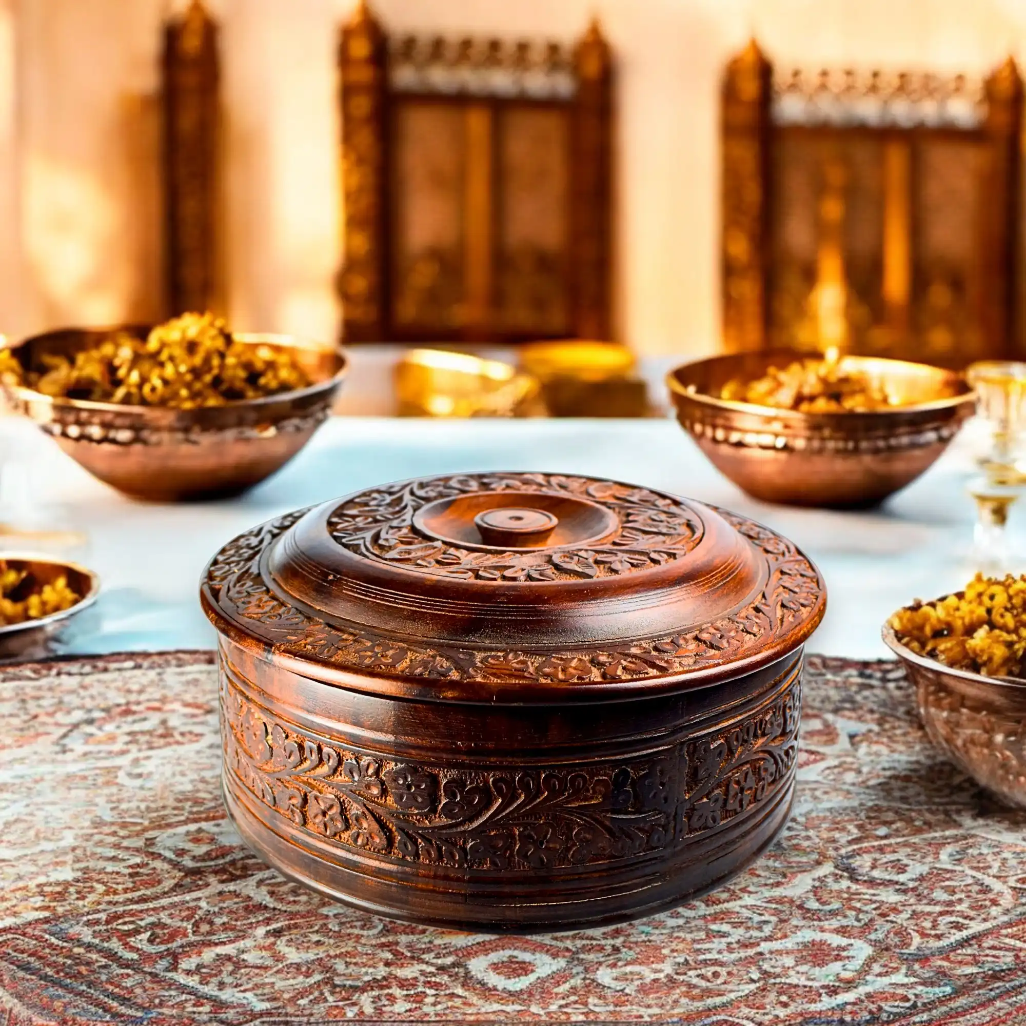 Gulnaar is a carved wooden hotpot that brings warmth to any space. Its design is inspired by floral patterns, carefully etched across the rim and body. The lid fits snugly and opens to a roomy, polished interior that works well for dry fruits, wrapped sweets, or just as a table-top piece. This is for those who appreciate craftsmanship that doesn’t ask for attention—but holds it.