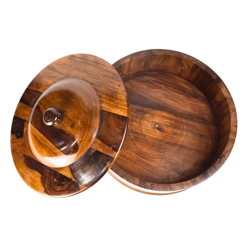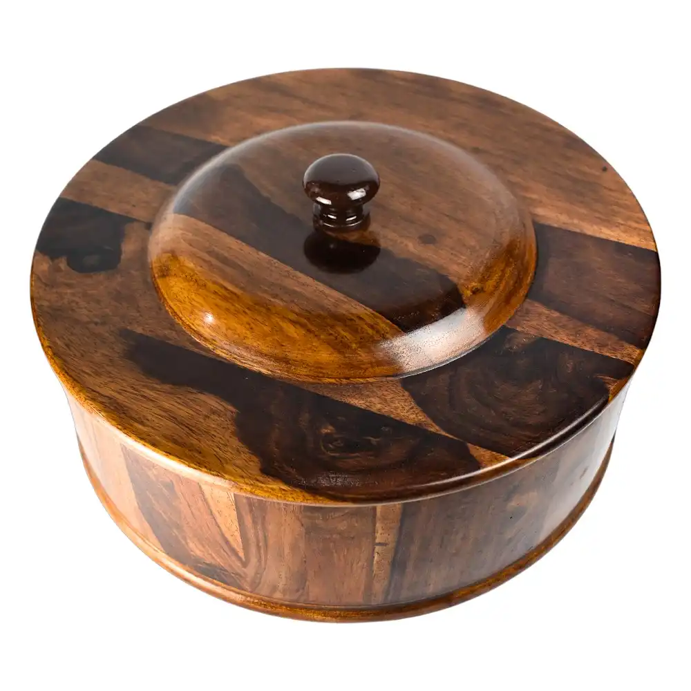 This masterpiece is called Baazgasht. A simple, practical hotpot made from solid sheesham wood. The natural wood grains are left visible, giving it a clean and grounded look. It’s well-sized for daily kitchen use—ideal for keeping roti, snacks, or even storing dry items. The lid fits nicely and is easy to lift. There’s no carving or brass here—just good woodwork done right. It’s the kind of piece that quietly fits in and does its job well.
