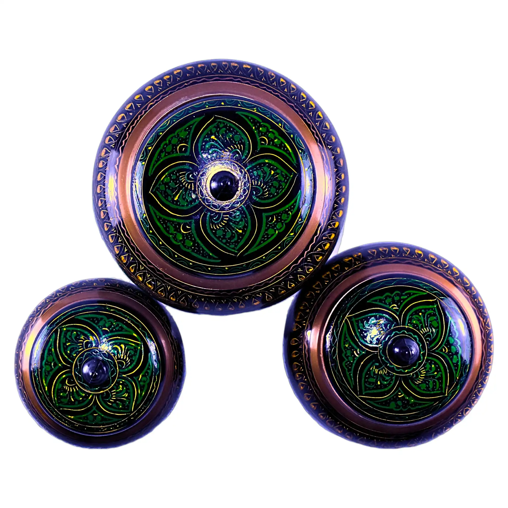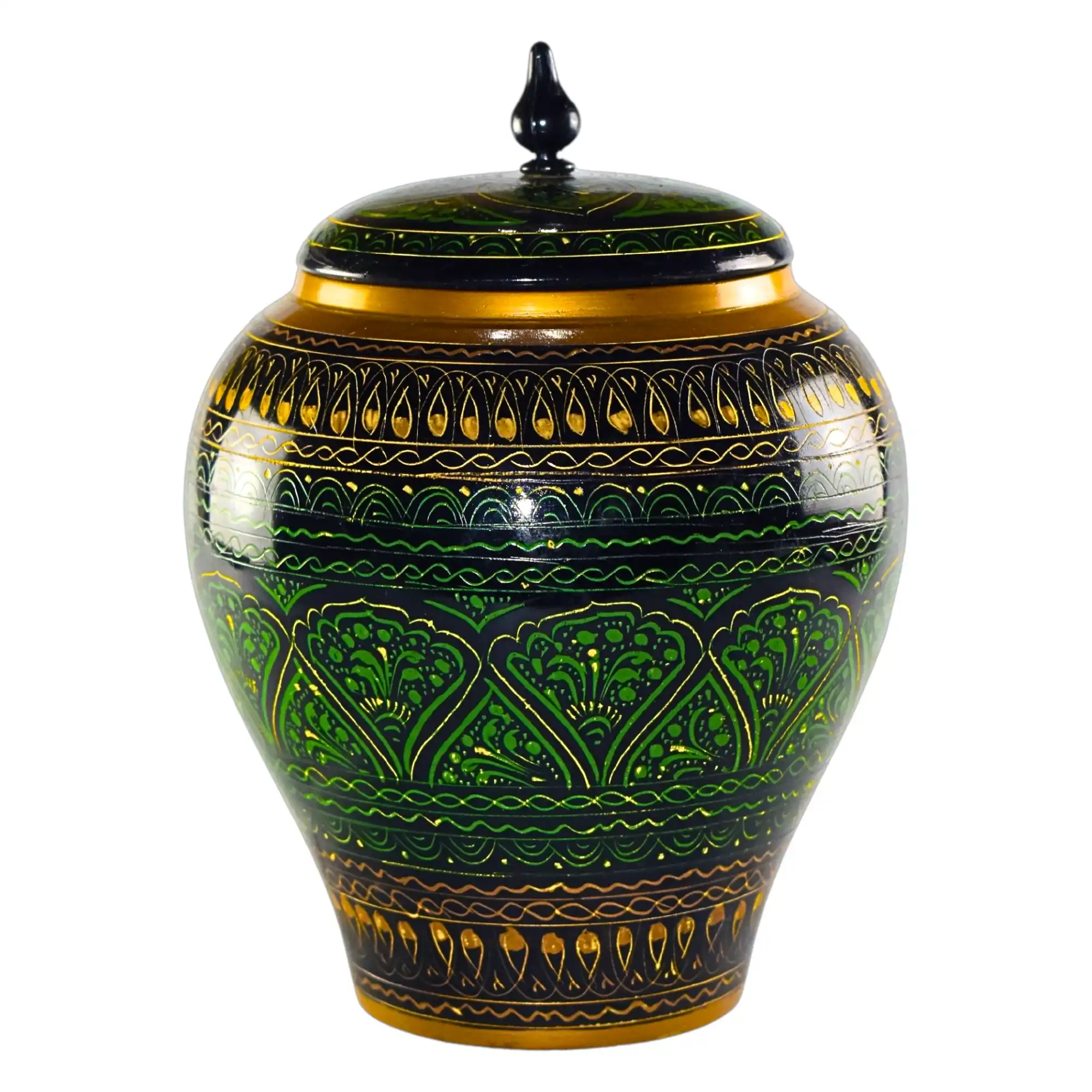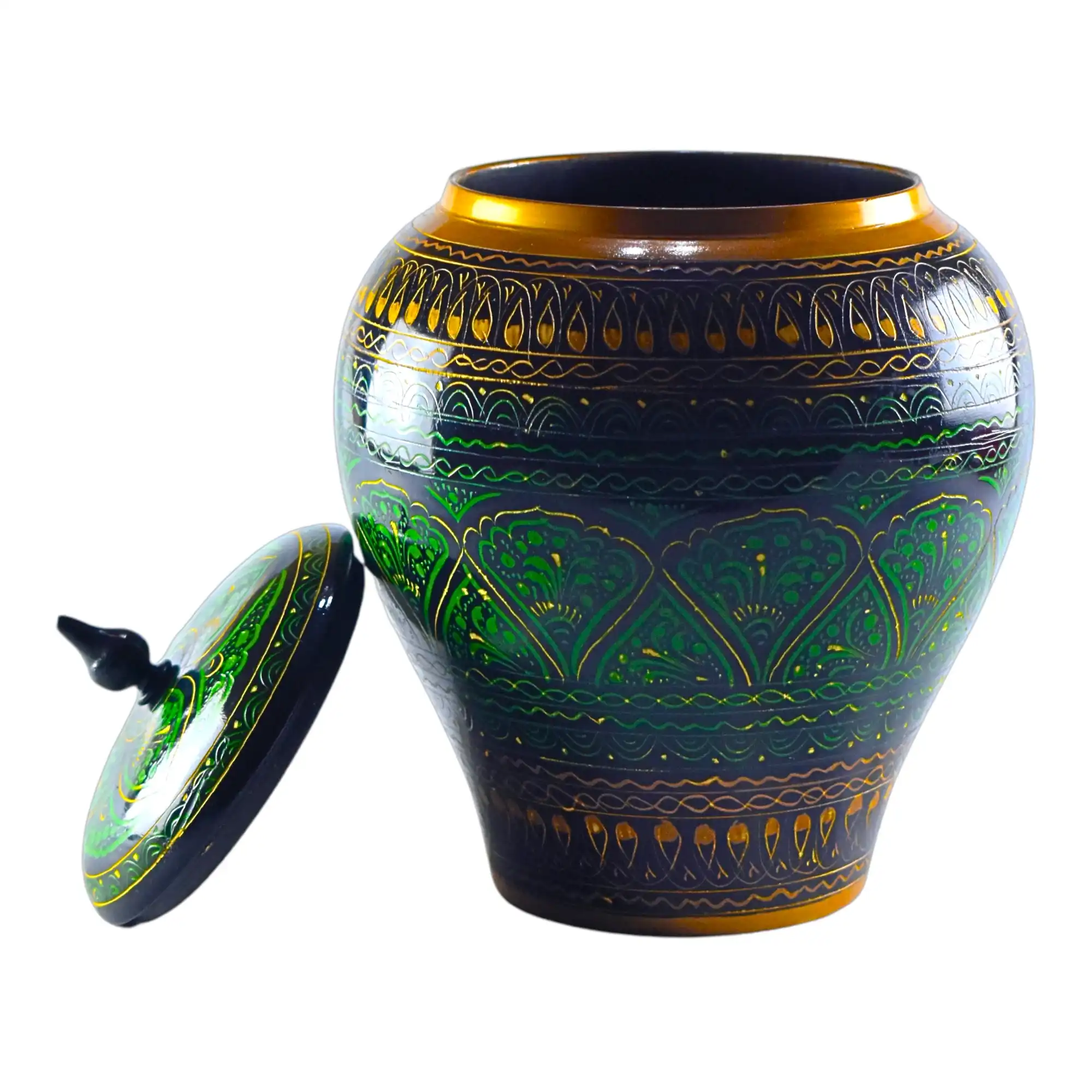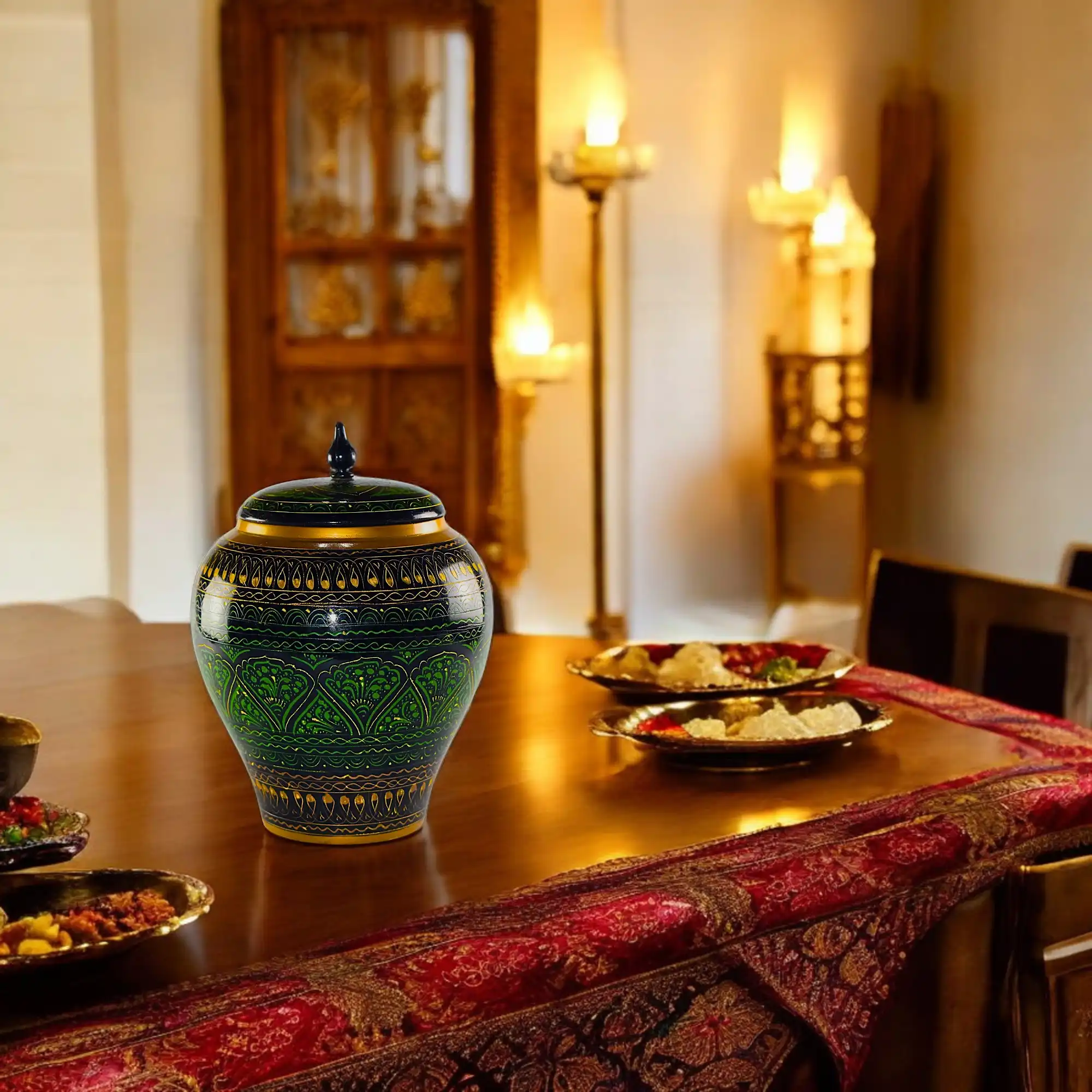When storage meets storytelling, you get this wooden decoration piece – a celestial trio of handcrafted wooden jars that look like they belong in a king’s pantry. Cloaked in deep black and veined with greens and golds, each jar holds not just what you put in it, but centuries of craft. The Naqshi work is bold, geometric, and wholly hypnotic – from the regal tulip motifs to the petal-like teardrop accents.