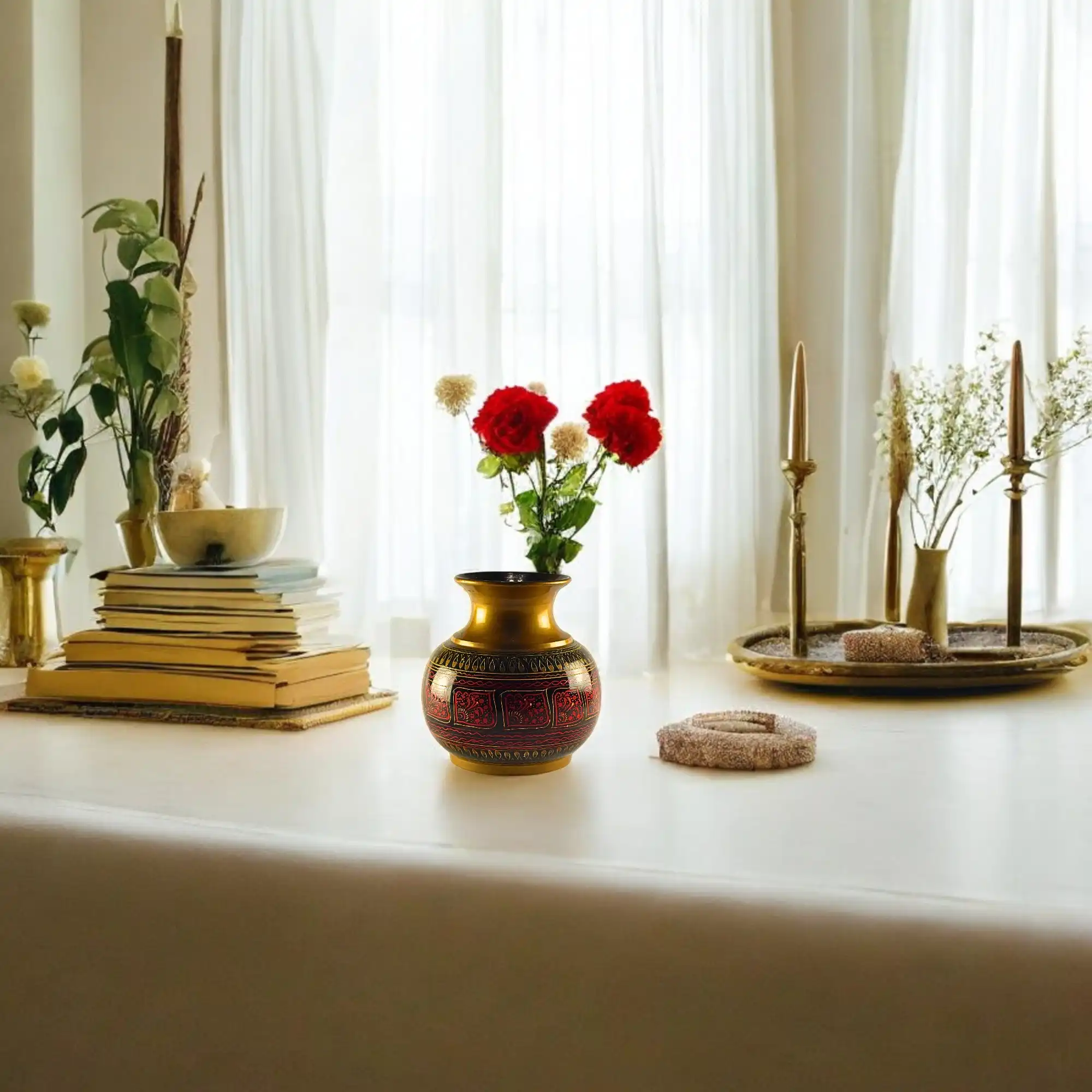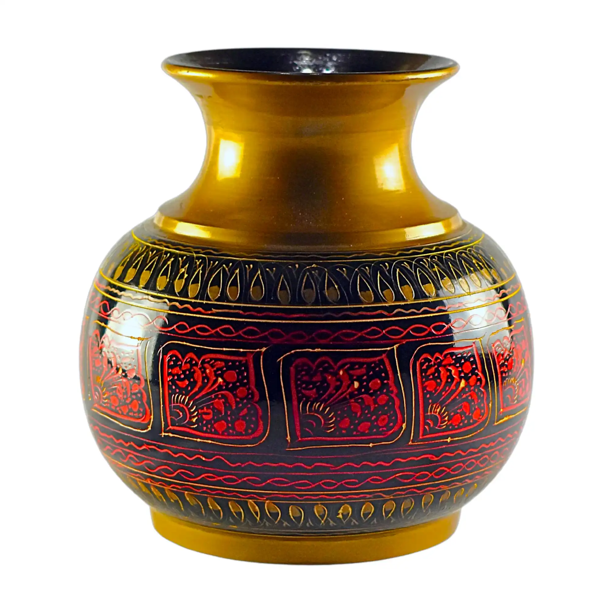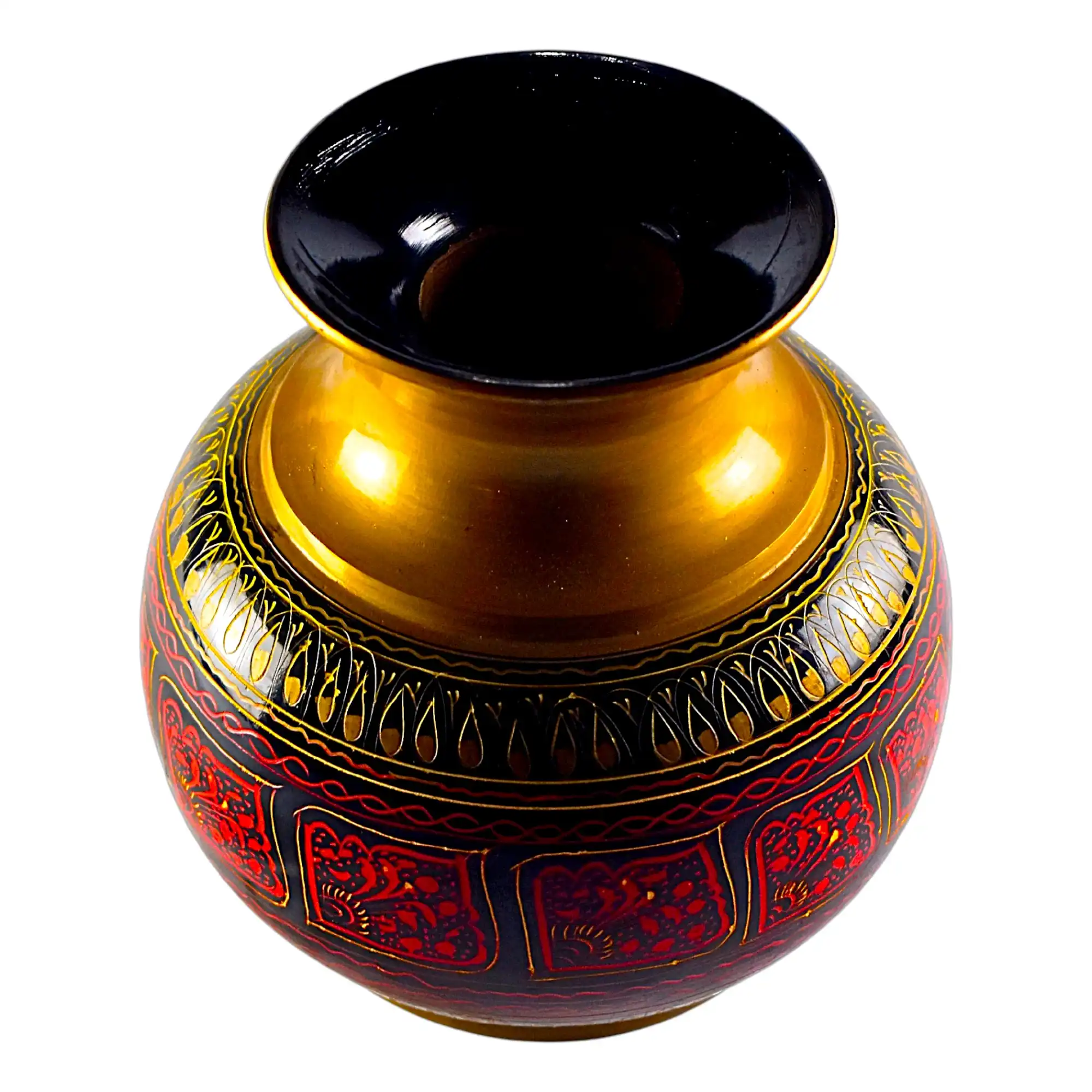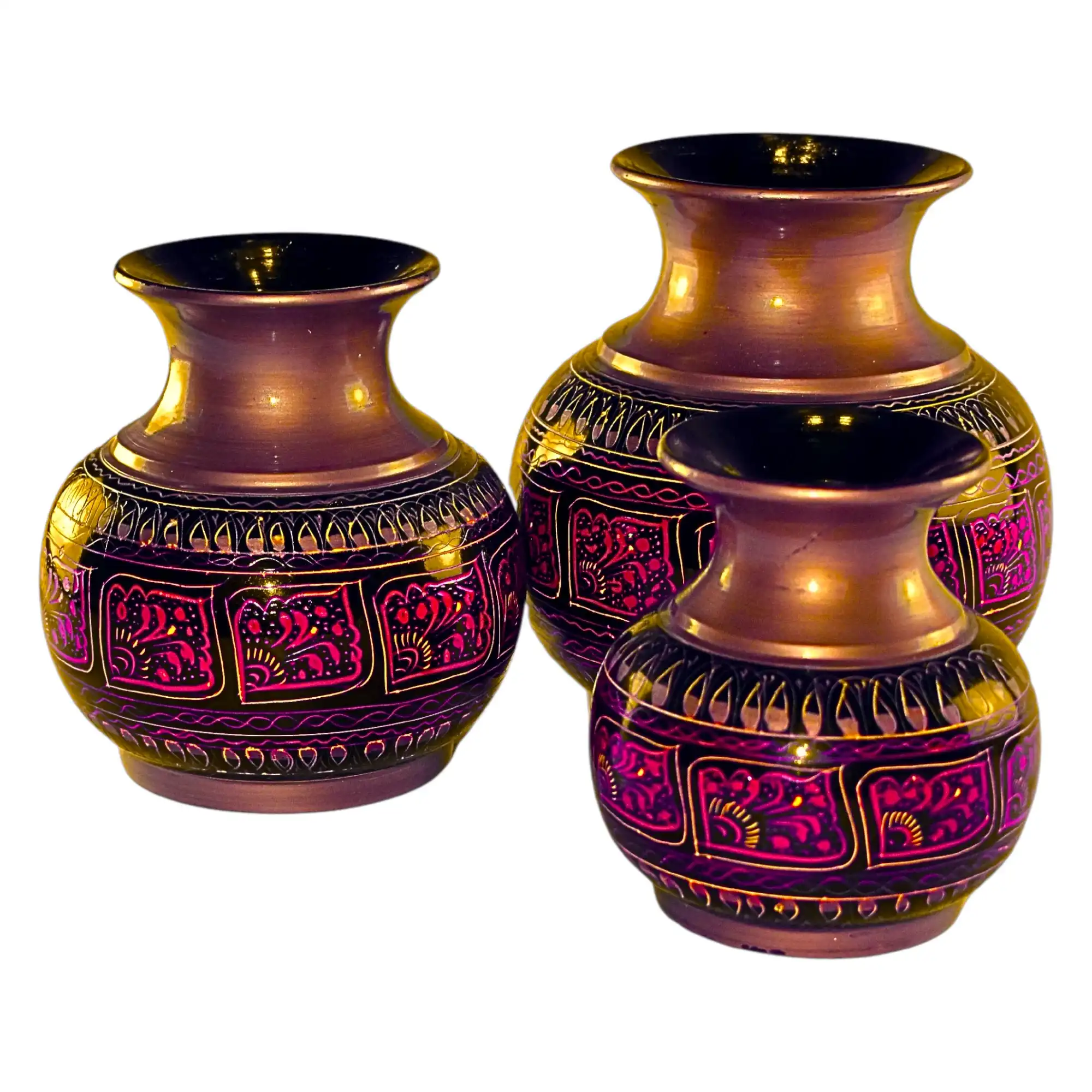 A quiet rebellion in form – this decoration piece marries the silhouette of an age-old pot with the flourish of ornamental floral art. Each vase in this trio stands with poise, wrapped in scarlet blooms and golden lining, as if plucked from a royal atelier. The black base hue deepens the contrast, making the Naqshi detail appear embroidered in firelight.