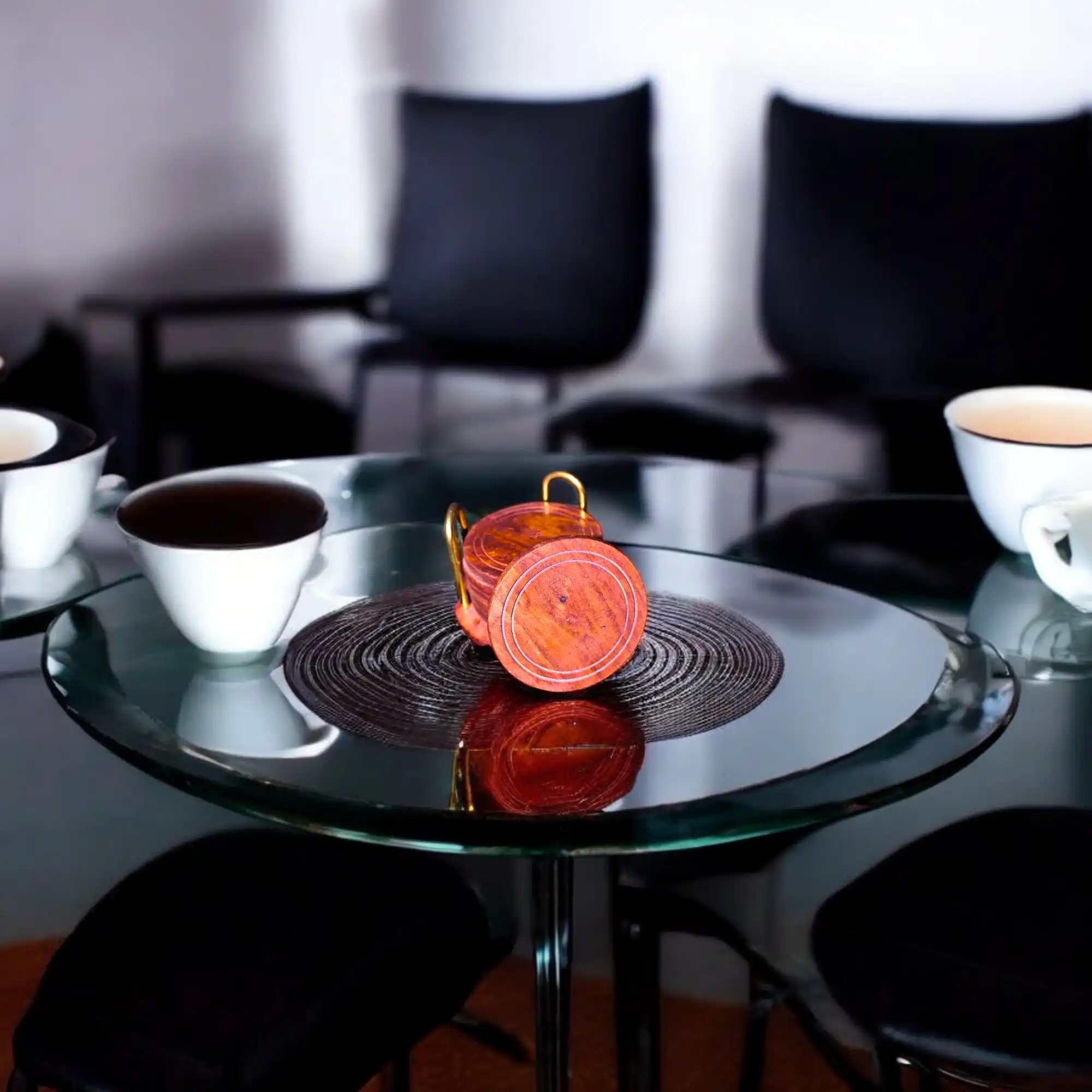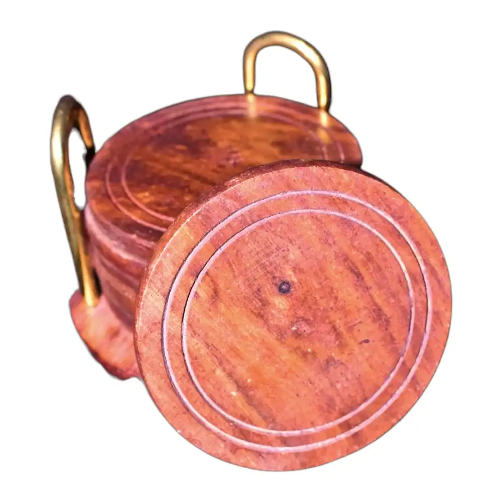 Wooden Tea Mat Set with Brass Holder – Set of 6 Coasters