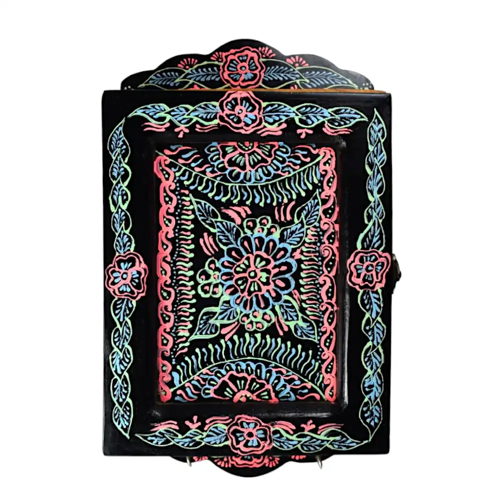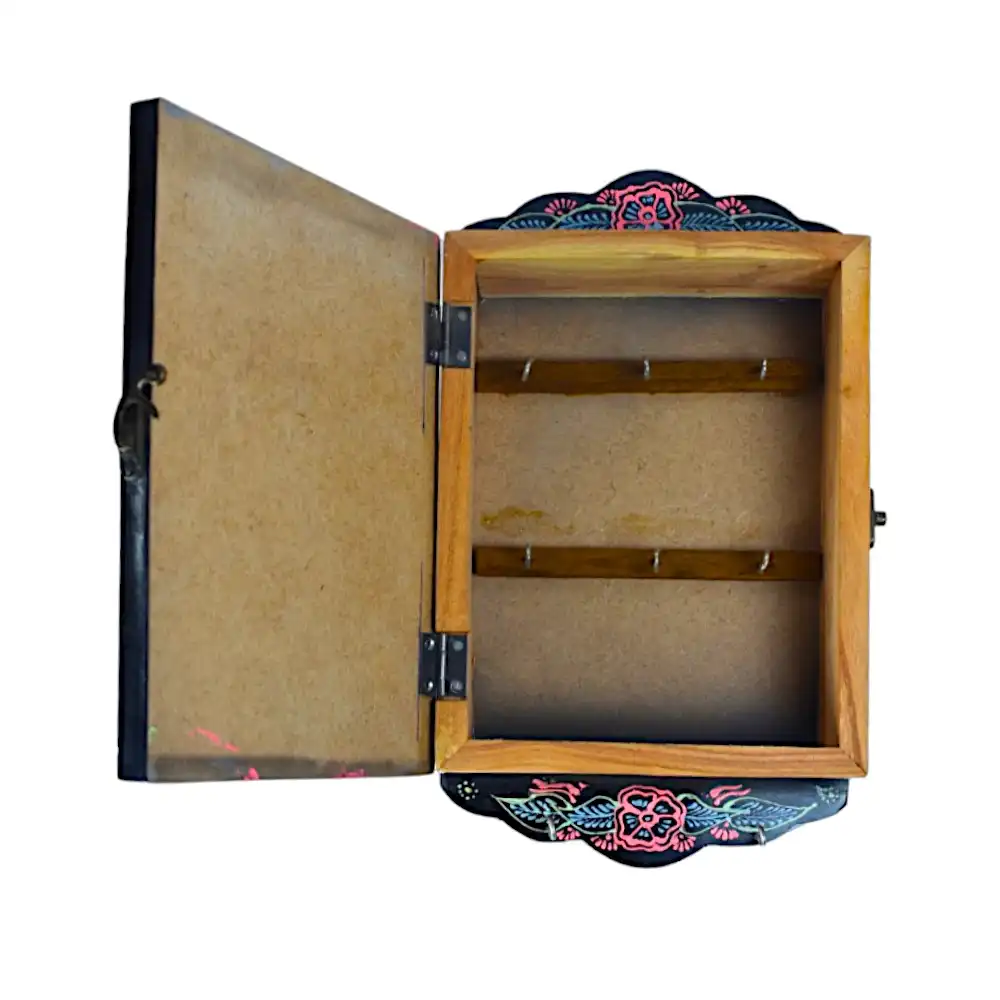 Keys are always missing until they’re not. This article solves the problem. It is made for entrances, garages, kitchens—wherever your day begins or ends. It’s a wall-hung wooden key cabinet finished in vivid truck art florals, hand-painted in enamel. Inside, two rows of hooks hold your keys in place. It closes with a simple brass latch and sits flush to the wall. Crafted from real wood and finished to age gracefully with time. Holds order without asking for attention.